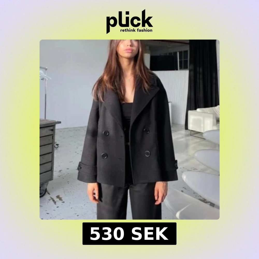 Stilren svart skepparkavaj med bred krage och dubbelknäppning framtill. Jackan har långa ärmar med dekorativa knappar vid ärmslut och en rak, loose passform. Perfekt för dig som gillar en klassisk och clean look.