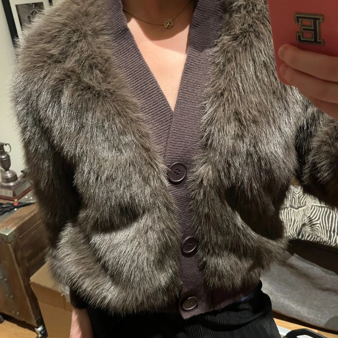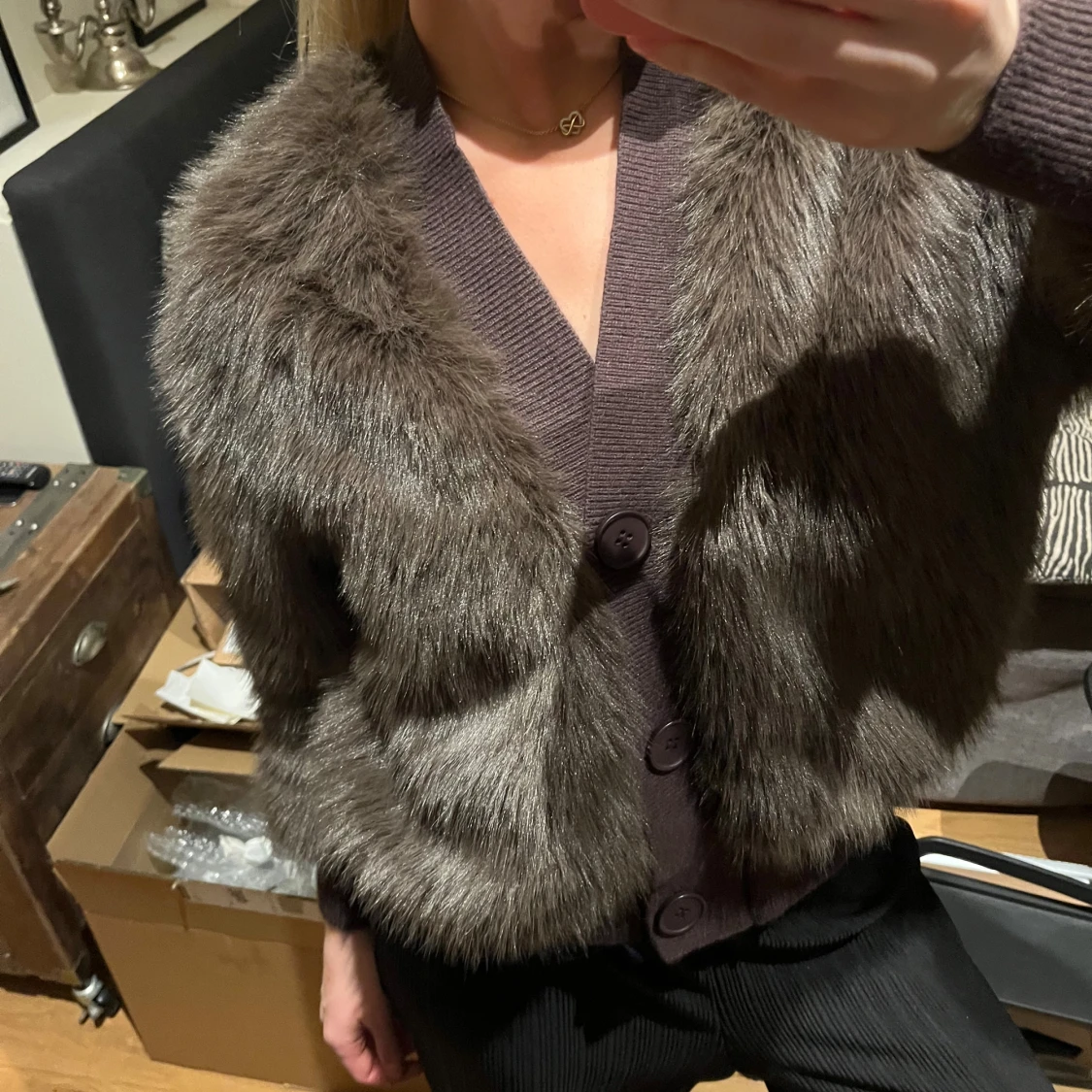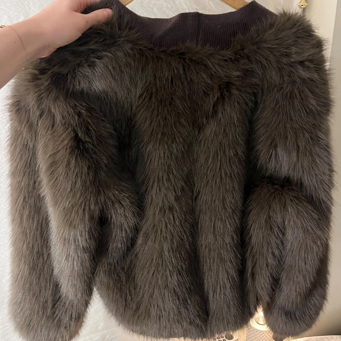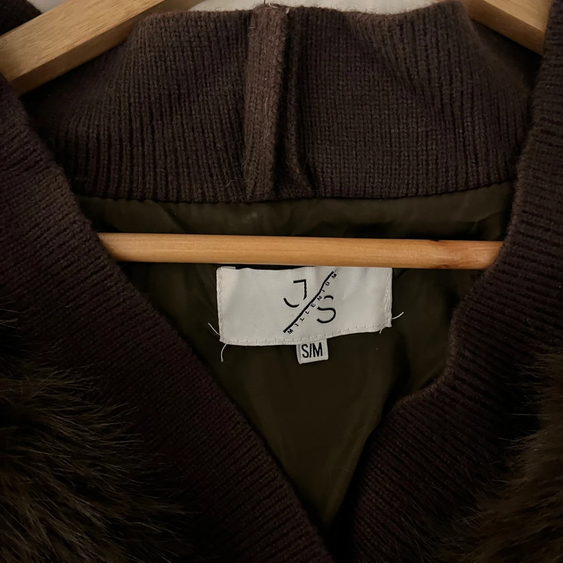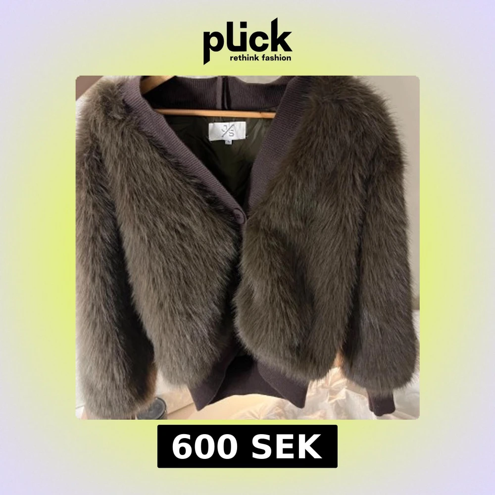 Säljer en fluffig brun pälsjacka från J/S i storlek S. Jackan har stora knappar framtill, ribbade muddar och v-ringad krage. Den är kortare i modellen och har långärmade ärmar. Perfekt för dig som vill sticka ut med en trendig look.