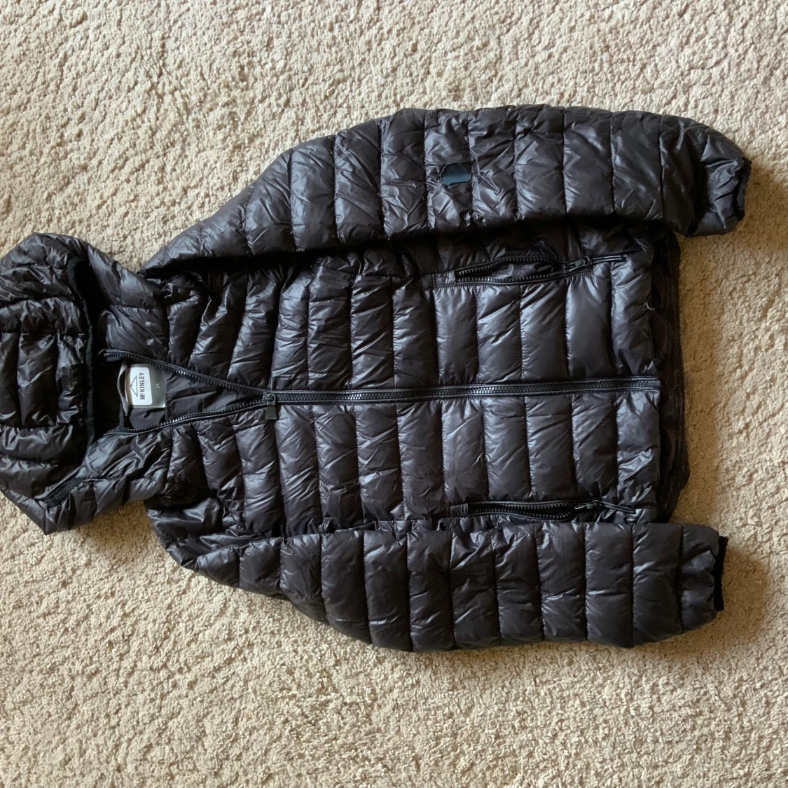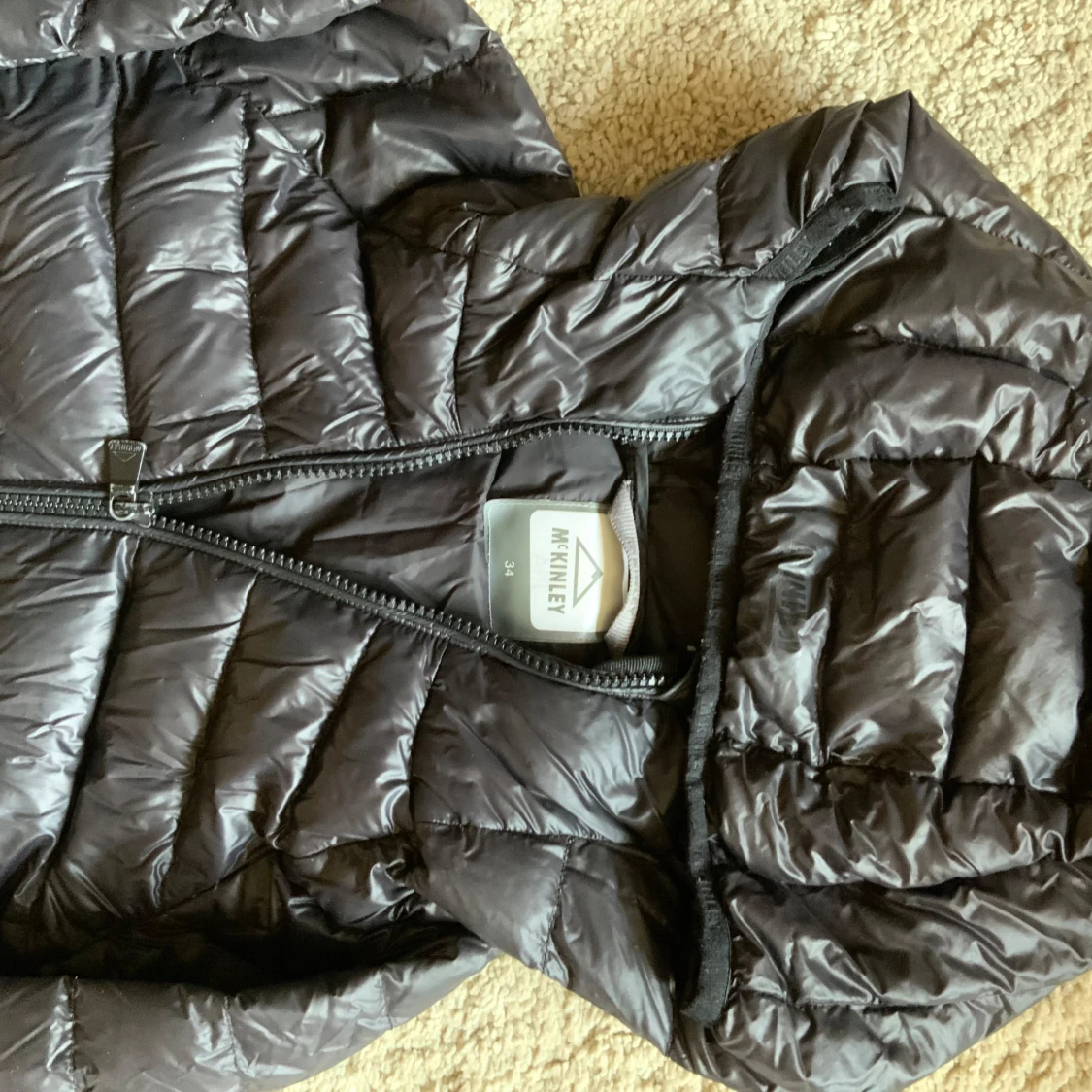 Säljer en svart dunjacka från McKinley med huva och dragkedja. Jackan är quiltad och perfekt för kyligare väder. Den har en stilren design och är lätt att matcha med olika outfits.