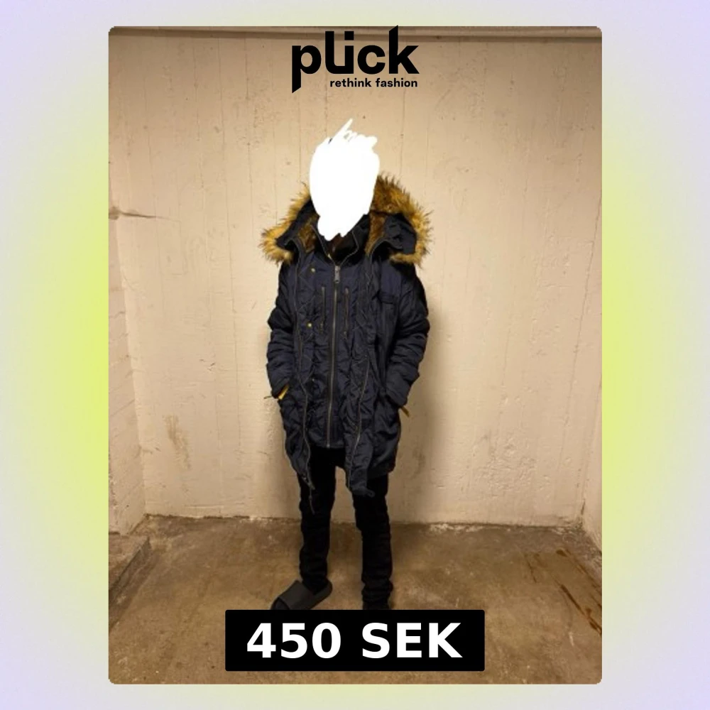 mörkblå jacka med huva och fuskpäls runt kanten. Jackan har dragkedja framtill, flera fickor och gula detaljer vid ärmsluten. Perfekt för kalla dagar och har en lite längre, loose passform.