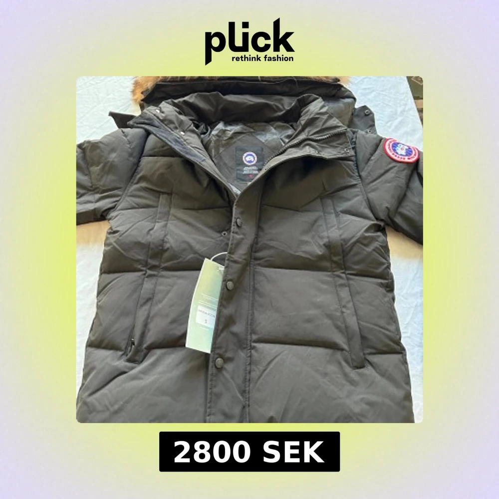 Säljer en svart Canada Goose med pälskant på huvan och klassisk logopatch på ärmen. Jackan har dragkedja och knappar framtill, två sidofickor och quiltad design. Perfekt för kalla vinterdagar och riktigt snygg streetstil.