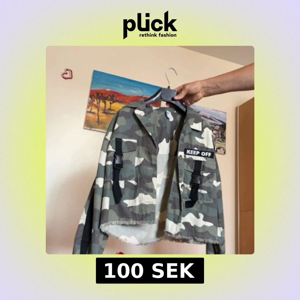 Säljer en oversized camouflage overshirt med coola svarta spännen på bröstfickorna och texten 'KEEP OFF' på ena sidan. Jackan har rå kant nertill och är i bomullsmaterial. Perfekt för dig som vill sticka ut med streetstyle-vibe.