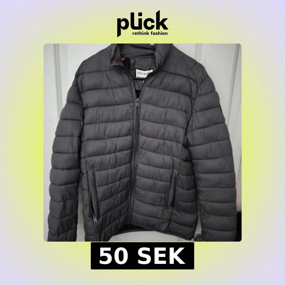 Säljer en mörkgrå pufferjacka från Shine Original med horisontella sömmar, hög krage och dragkedja framtill. Jackan har två fickor med dragkedja och en snygg patch på ärmen. Perfekt för kyliga dagar och enkel att matcha med det mesta.