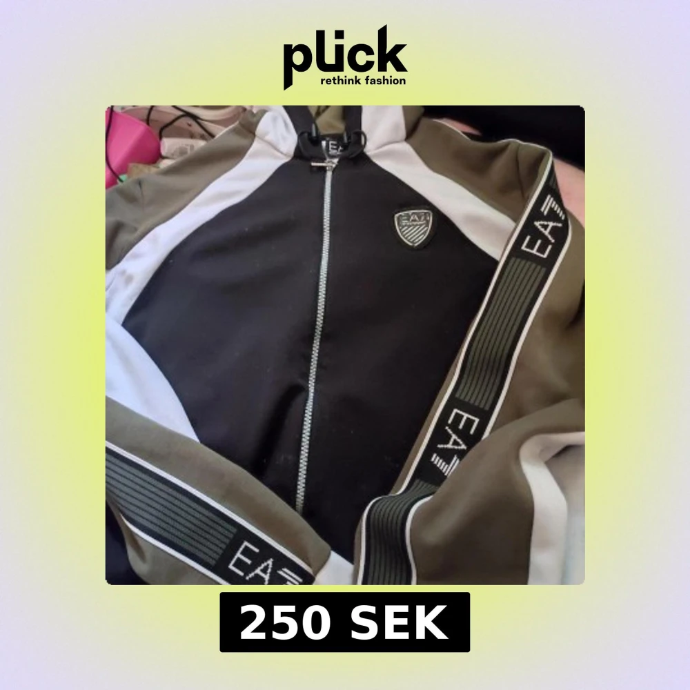 Säljer en sportig zip-jacka från EA7 Emporio Armani i svart, olivgrönt och vitt. Jackan har dragkedja framtill, EA7-logga på bröstet och breda loggoremmar längs ärmarna. Perfekt för en streetwear-look. Säljes tillsammans för 250kr