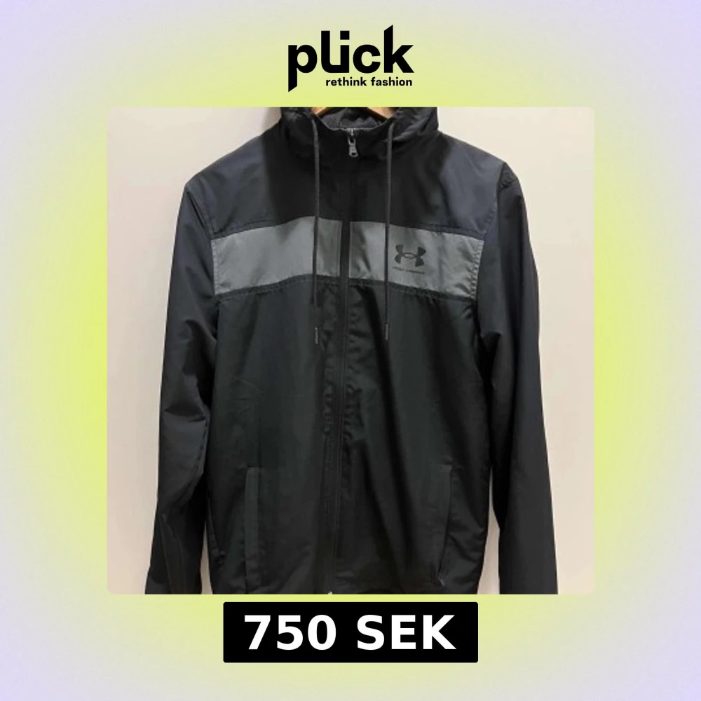 Säljer en svart vindjacka från Under Armour med grått parti över bröstet. Jackan har dragkedja och justerbar huva med dragsko. Perfekt för blåsiga dagar.🙌