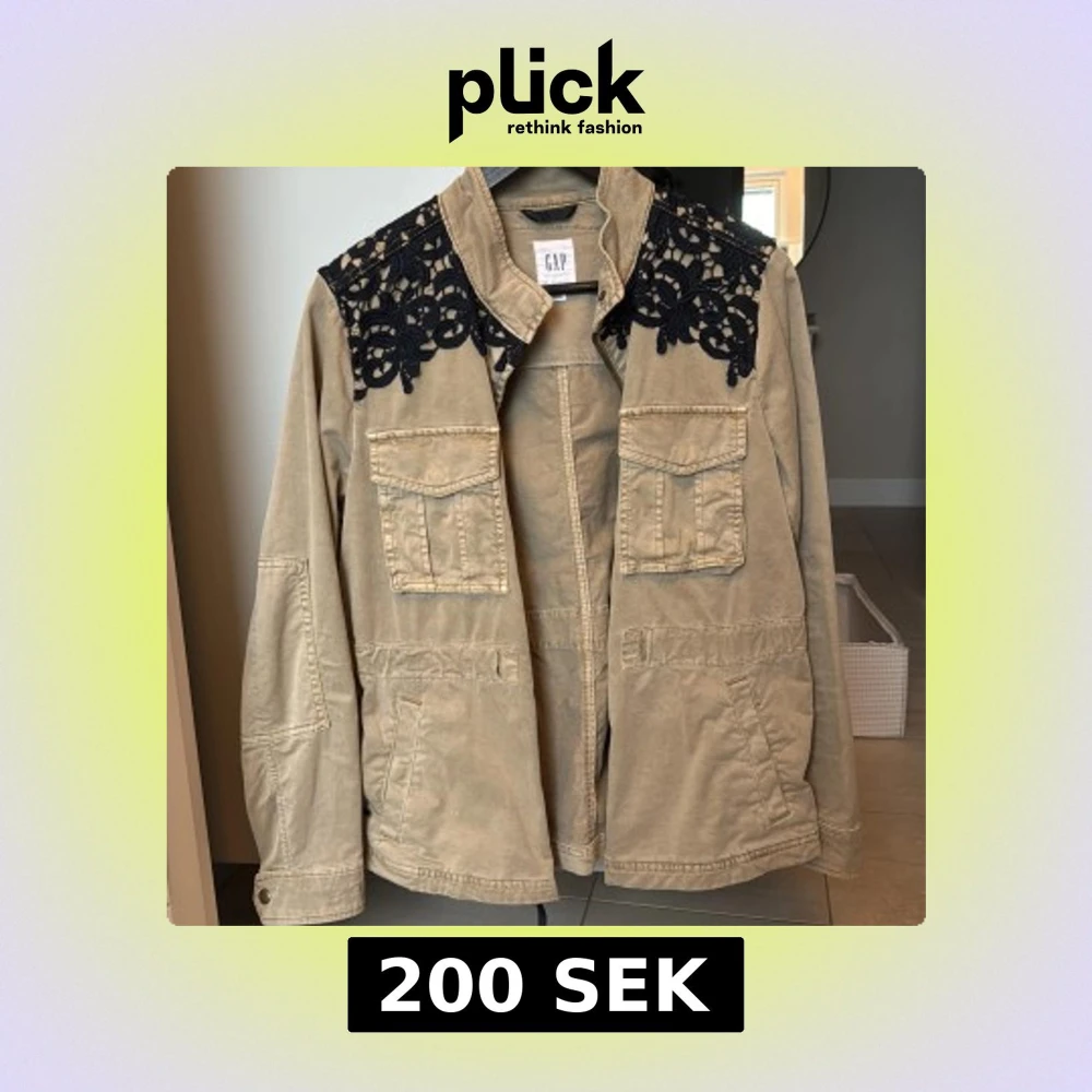 Snygg beige jacka från GAP med unika svarta spetsdetaljer på axlarna. Jackan har flera praktiska fickor framtill och knäppning med knappar. Perfekt för en stilren look.