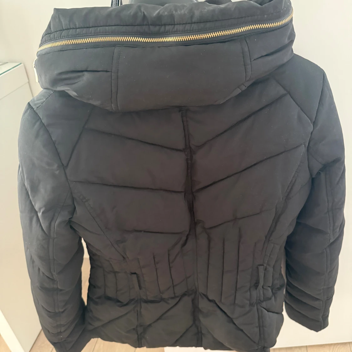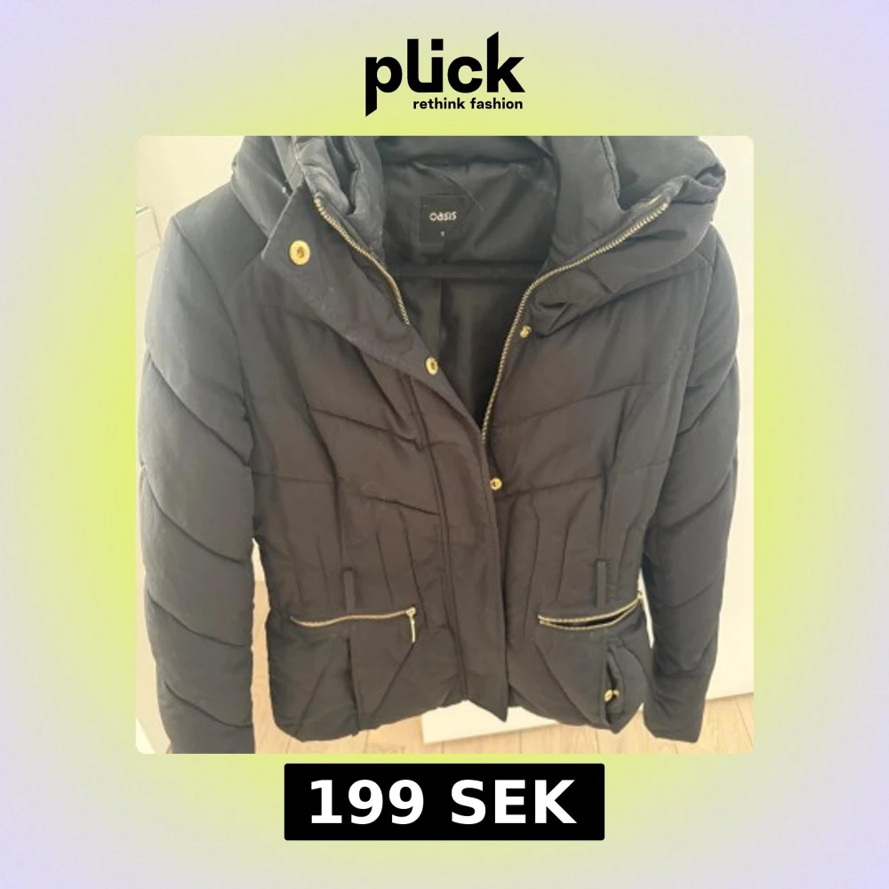 Säljer en svart pufferjacka från Oasis med guldig dragkedja och knappar. Jackan har huva, två fickor med dragkedja och snygg quiltad design. Perfekt för kyliga dagar och riktigt skön att bära. Passar dig som gillar stilren och enkel look.