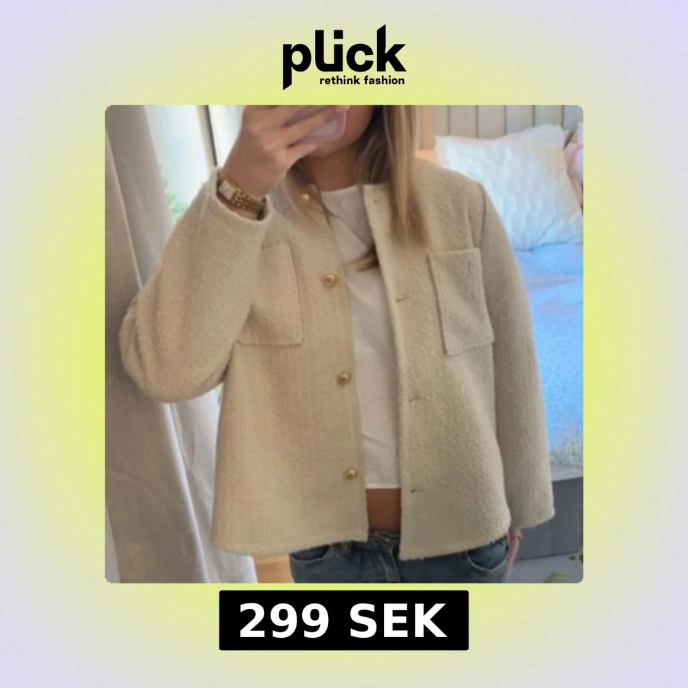 Säljer en stilren beige jacka från Cortefiel. Jackan har en normal passform med långa ärmar och knappar framtill. Den är tillverkad i ett strukturerat material och har två framfickor med knappar. Det står att den är i XL men absolut inte mer som en S