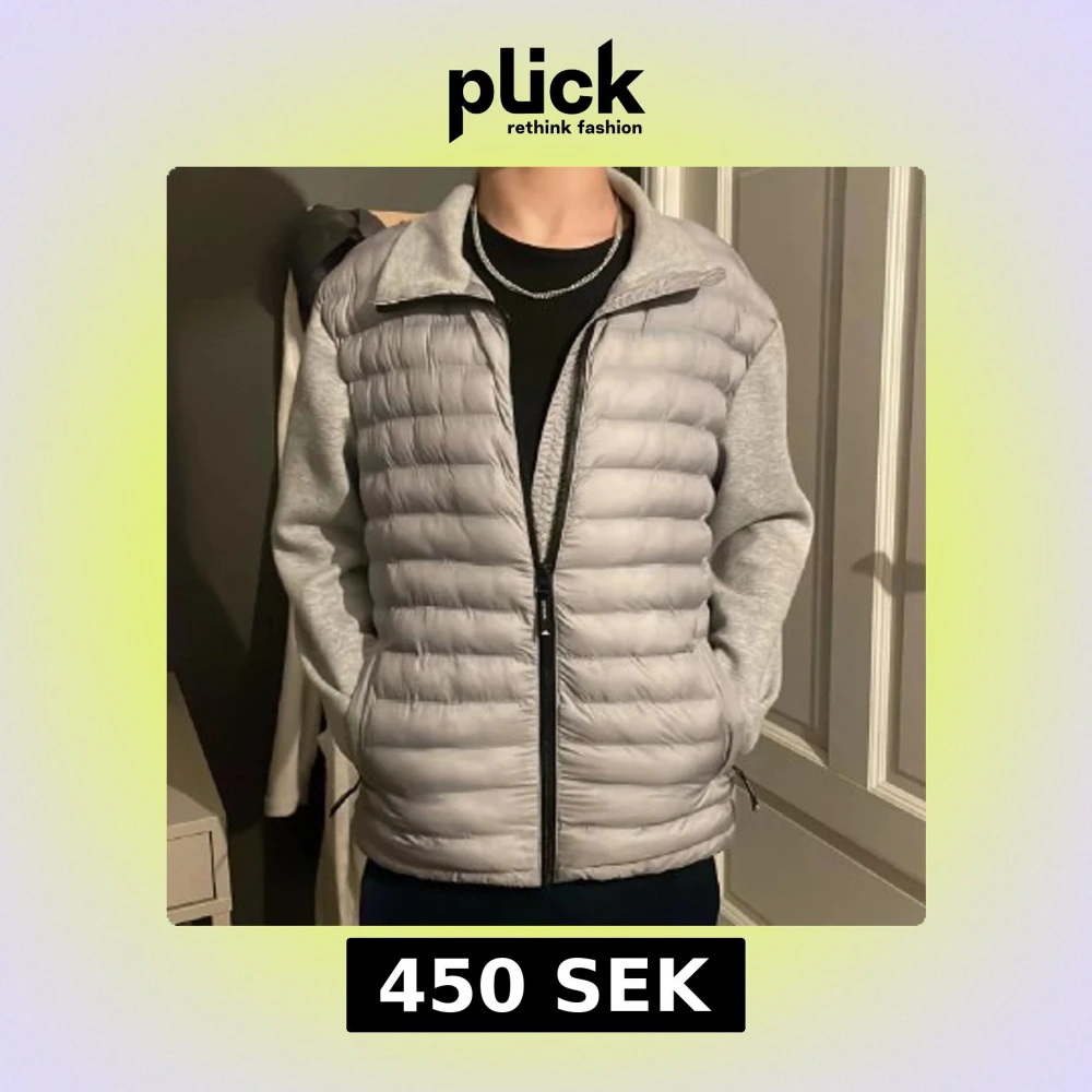 Säljer en ljusgrå pufferjacka med quiltad framsida och ärmar i mjukt sweatshirtmaterial. Jackan har dragkedja framtill och ståkrage. Perfekt för lager-på-lager och en stilren look.