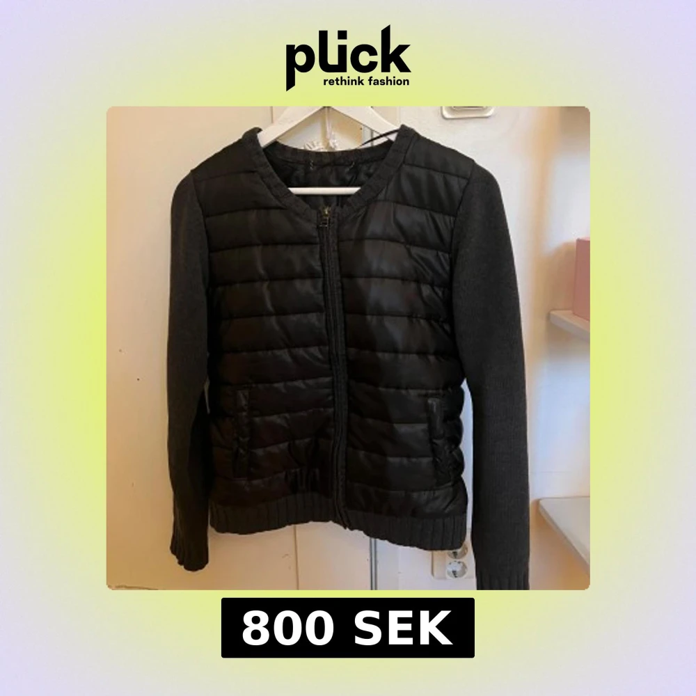 Snygg svart jacka med quiltad framsida och stickade ärmar. Jackan har en dragkedja framtill och två praktiska fickor. Den har inga defekter, förutom fickan intill som är lagad, de syns ingenting utanpå!🥰
