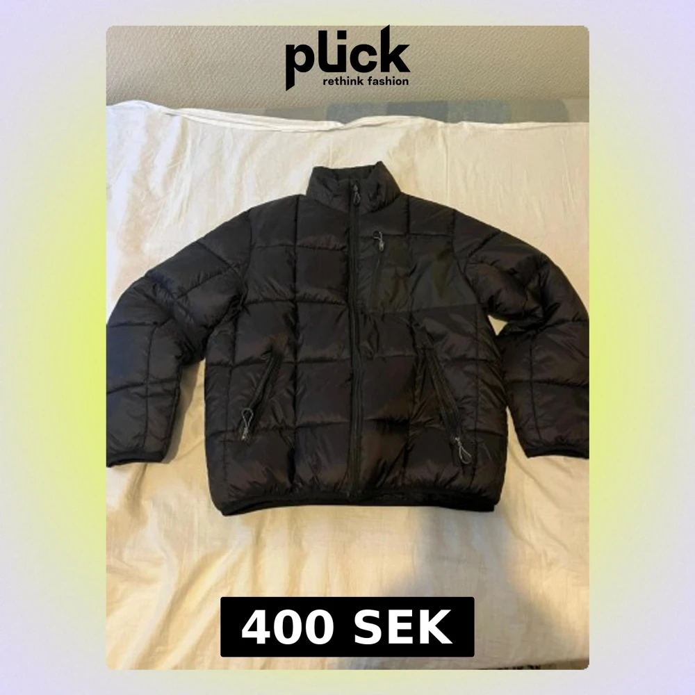 Svart pufferjacka med quiltad design och hög krage. Jackan har tre praktiska fickor med dragkedja framtill och en stilren look. Materialet är syntet och jackan är perfekt för kyliga dagar. Storleken är M men den är liks liten som S.
