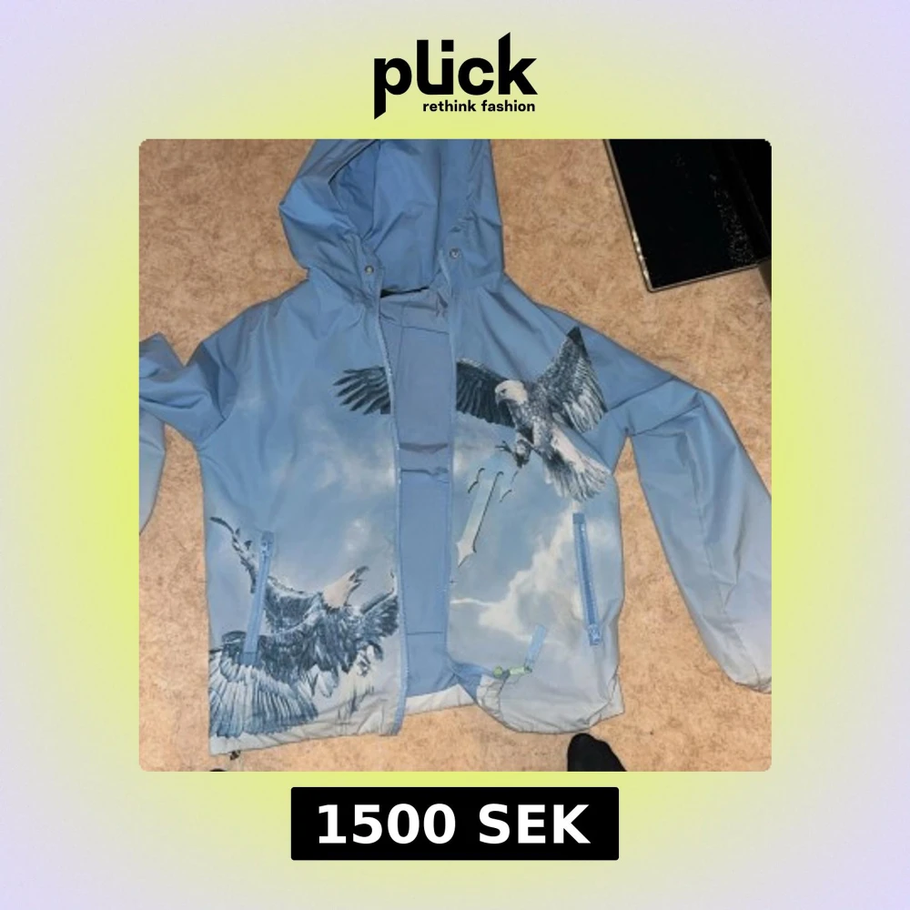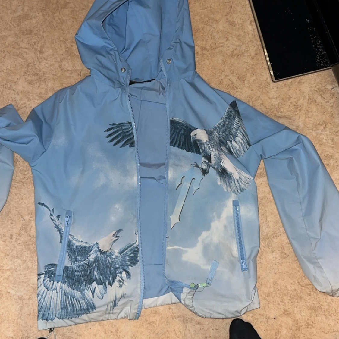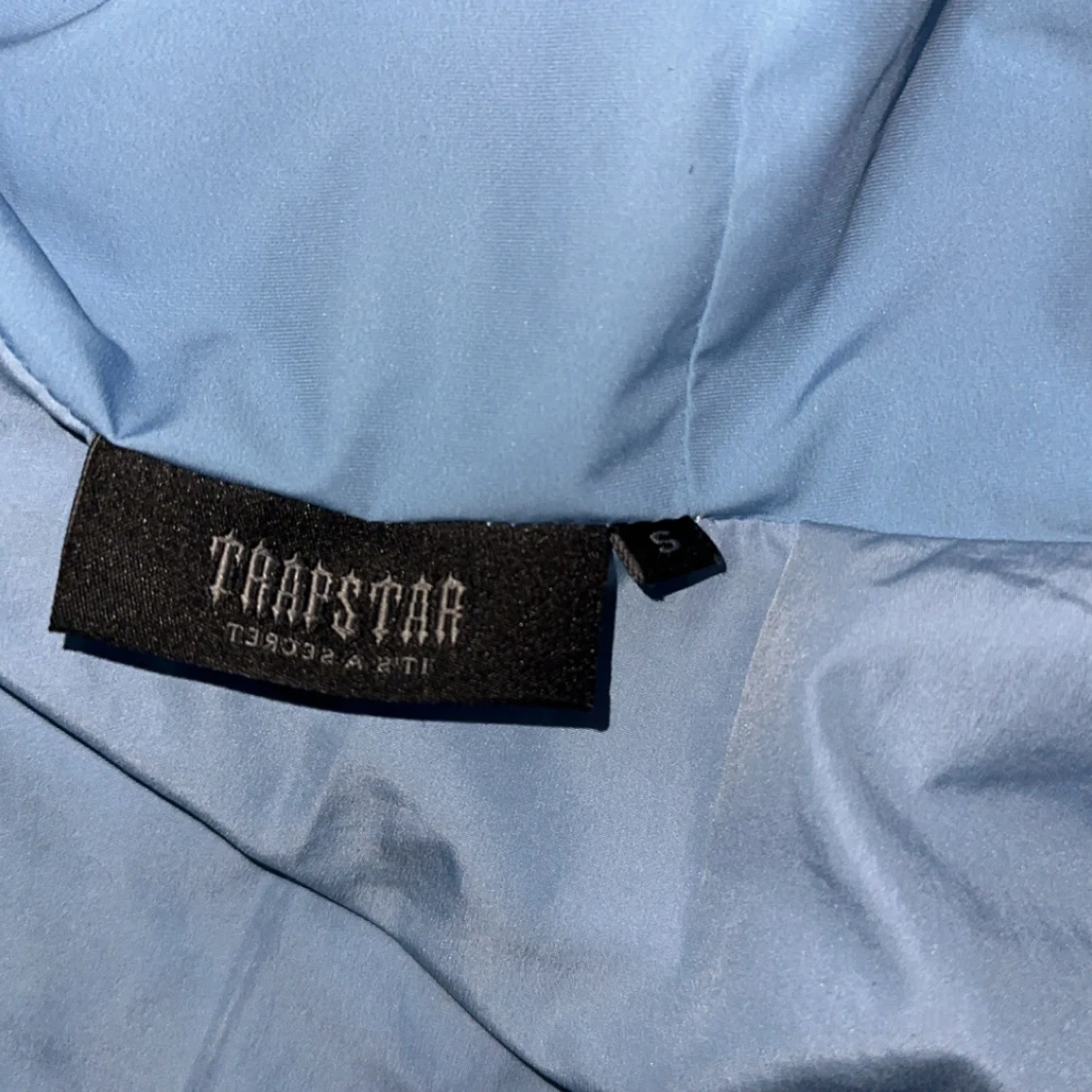 Säljer en blå vindjacka från Trapstar med sjukt snyggt örntryck över hela jackan och dragkedjor på fickorna. Jackan har huva och coola detaljer med Trapstar-loggan på ryggen. Perfekt för dig som vill sticka ut med streetstyle. Hör av dig vid pris eller så