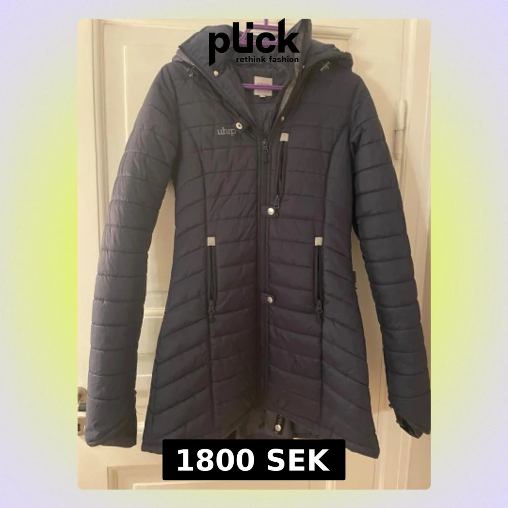 Säljer en mörkblå ridjacka från Uhip med huva och långa ärmar. Jackan är quiltad, har dragkedjor framtill och flera praktiska fickor. Längre modell som ger extra värme och skydd mot väder. Perfekt för kyliga dagar och har en stilren look. Den är i 160 men funkar upp till M tror jag