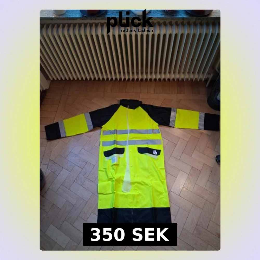 Säljer en lång gul och svart regnjacka från LB med huva, stora fickor och breda reflexband över bröst, rygg och ärmar. Jackan har knappar framtill och detaljer i svart på fickorna samt logga. Perfekt när du vill synas och hålla dig torr.... ny pris ca 1500 kr