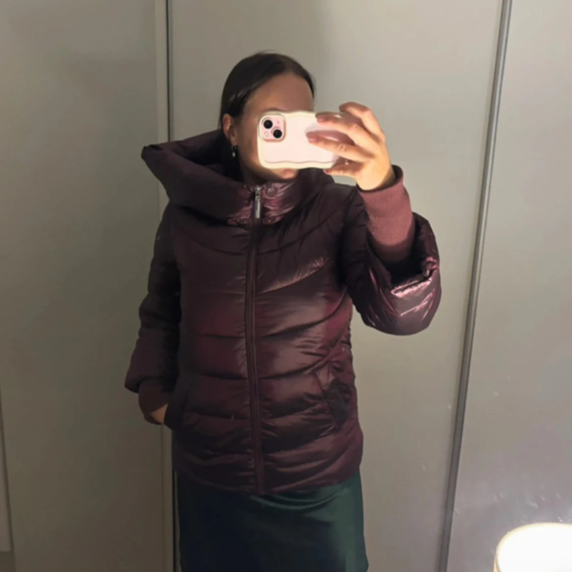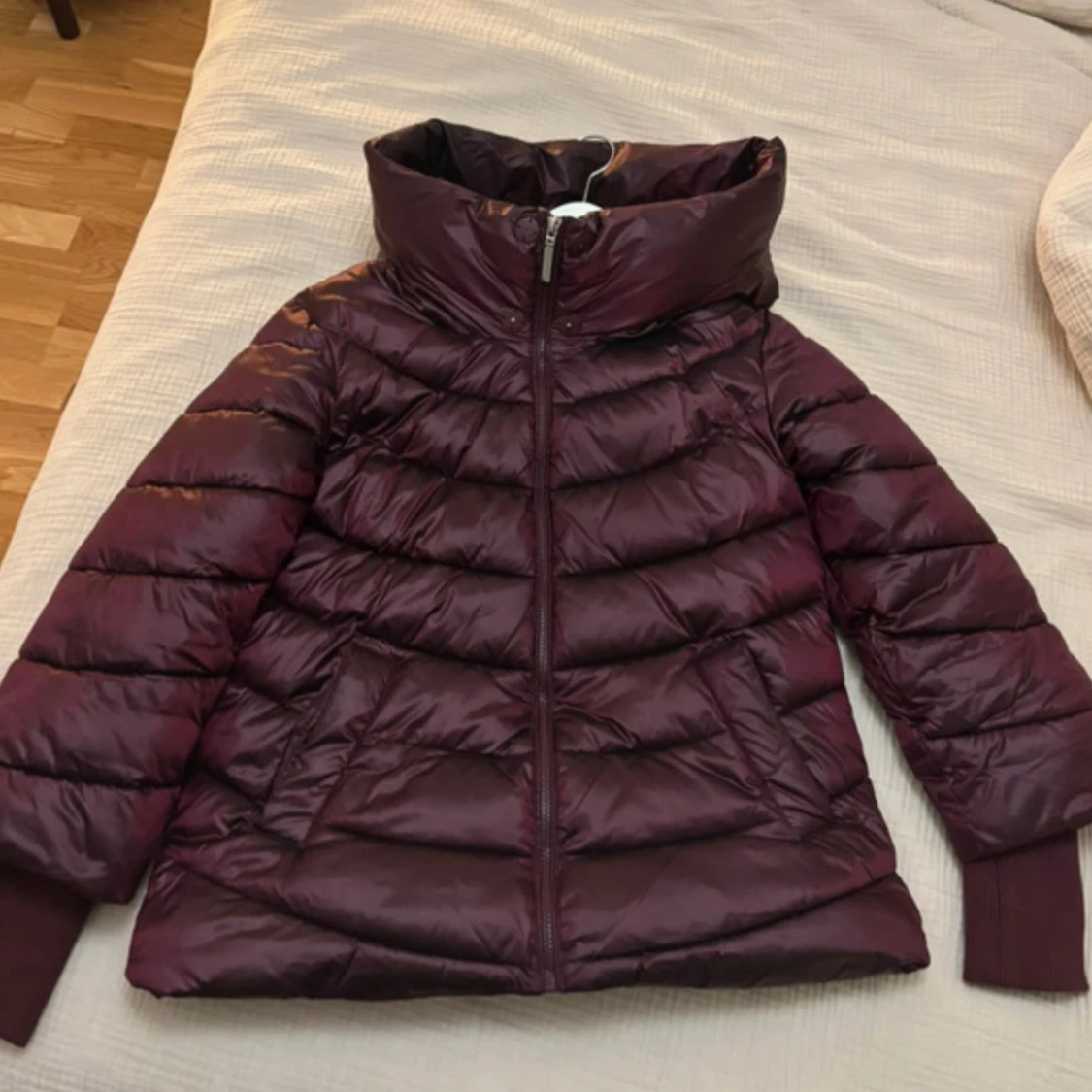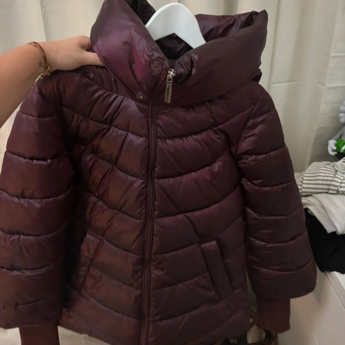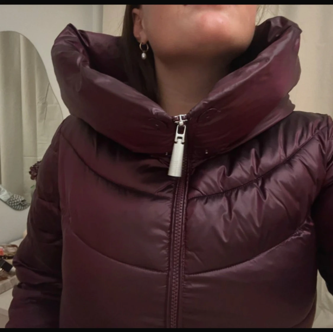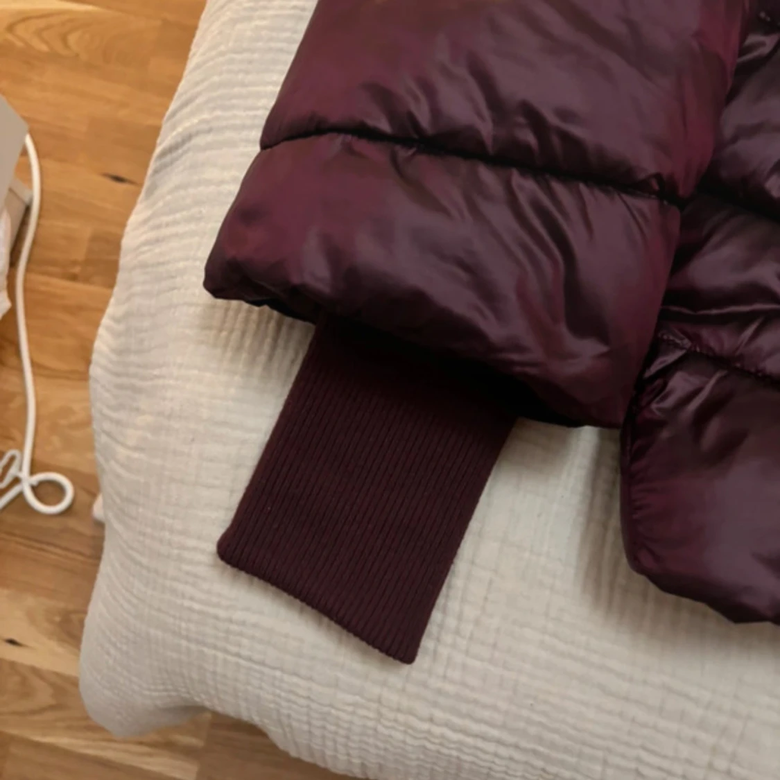 Säljer en vinröd pufferjacka med hög krage och breda ribbade muddar. Jackan har dragkedja framtill och två fickor på sidorna. Kragen går att vila mer med hjälp av 2 knappar, har stor mysig luva och varma armar, köptes förra året från tatuum, st s men passar en M lila bra💗inga defekter på jackan. Köpt för 5000 kr