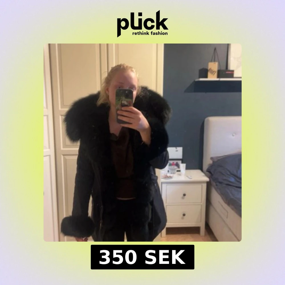 Säljer en svart pälsjacka med extra fluffig krage och muddar. Jackan har en lång siluett och dragkedja framtill. Materialet är päls och syntet, vilket gör den riktigt varm och snygg. Perfekt för dig som vill sticka ut med en statement-jacka i vinter.