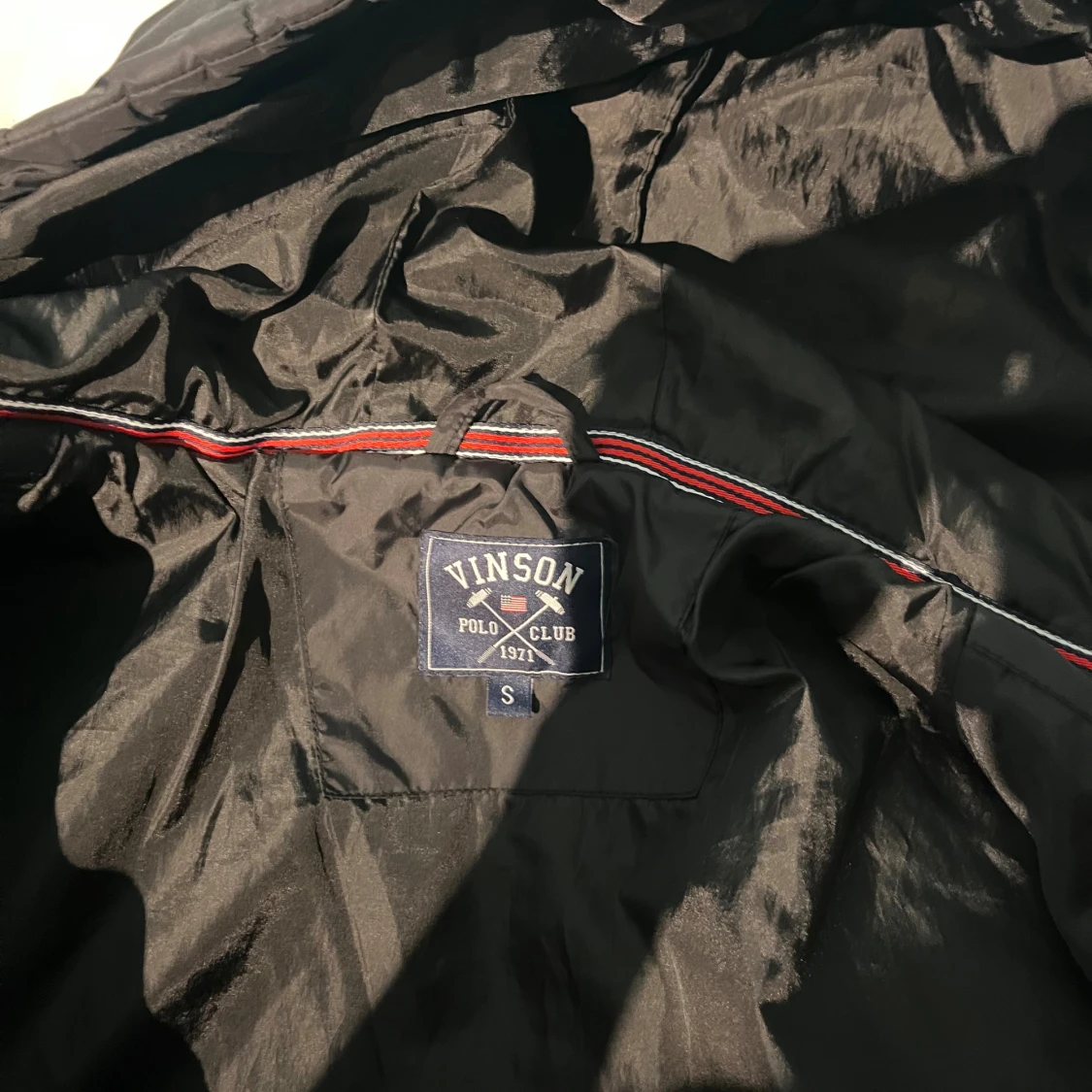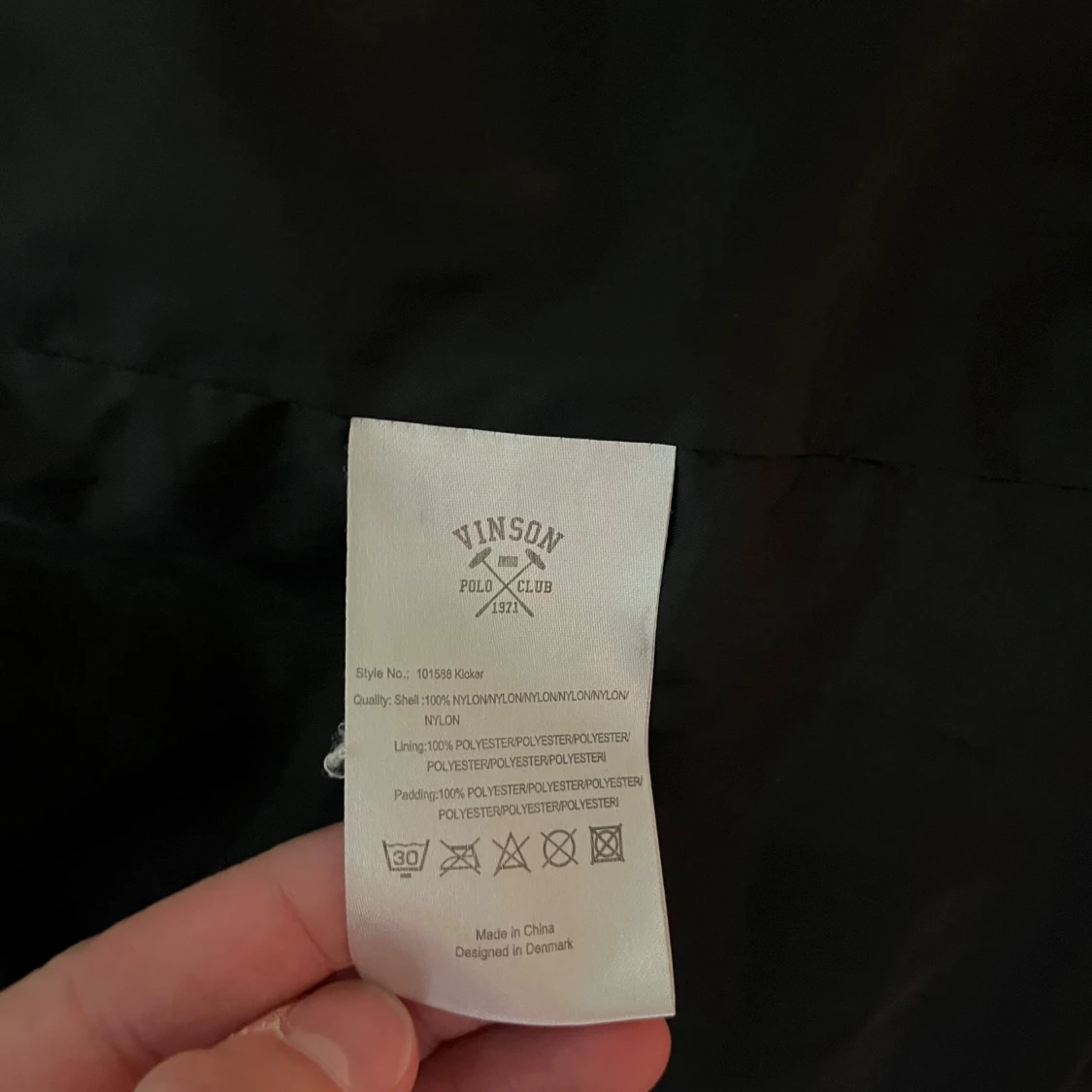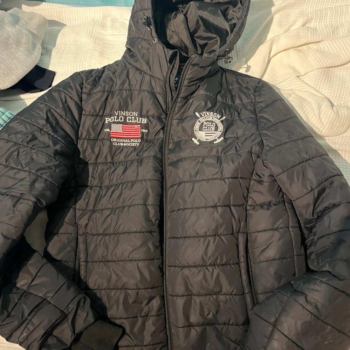 Svart pufferjacka från Vinson Polo Club med broderade loggor på bröstet och huva. Jackan har quiltad design, dragkedja framtill och ribbade muddar. Materialet är nylon på utsidan och polyesterfoder. Perfekt för kyliga dagar.