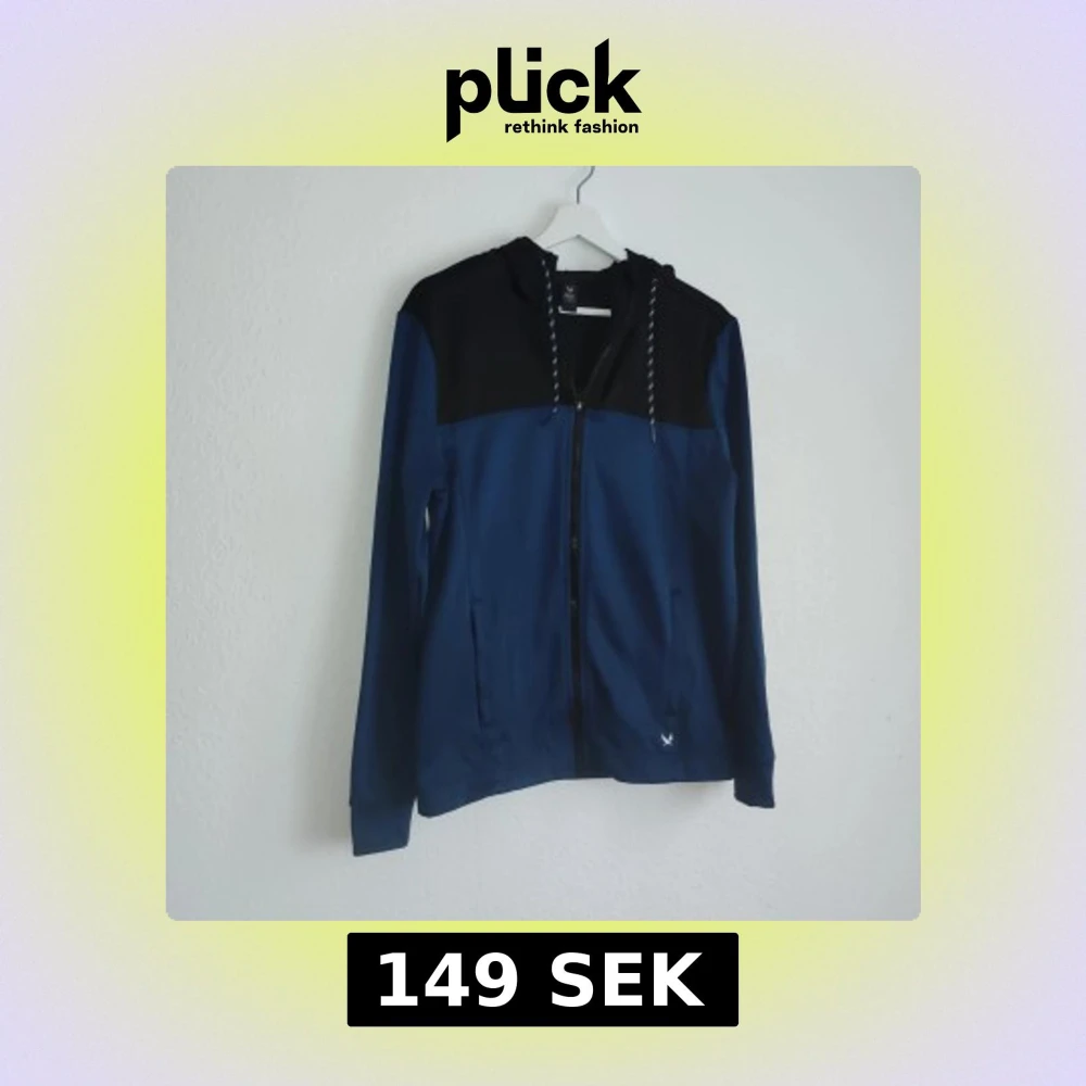 Säljer en snygg blå och svart jacka från SOC med dragkedja och huva. Jackan har långa ärmar och en stilren design med en liten logga på framsidan. Perfekt för en casual look.