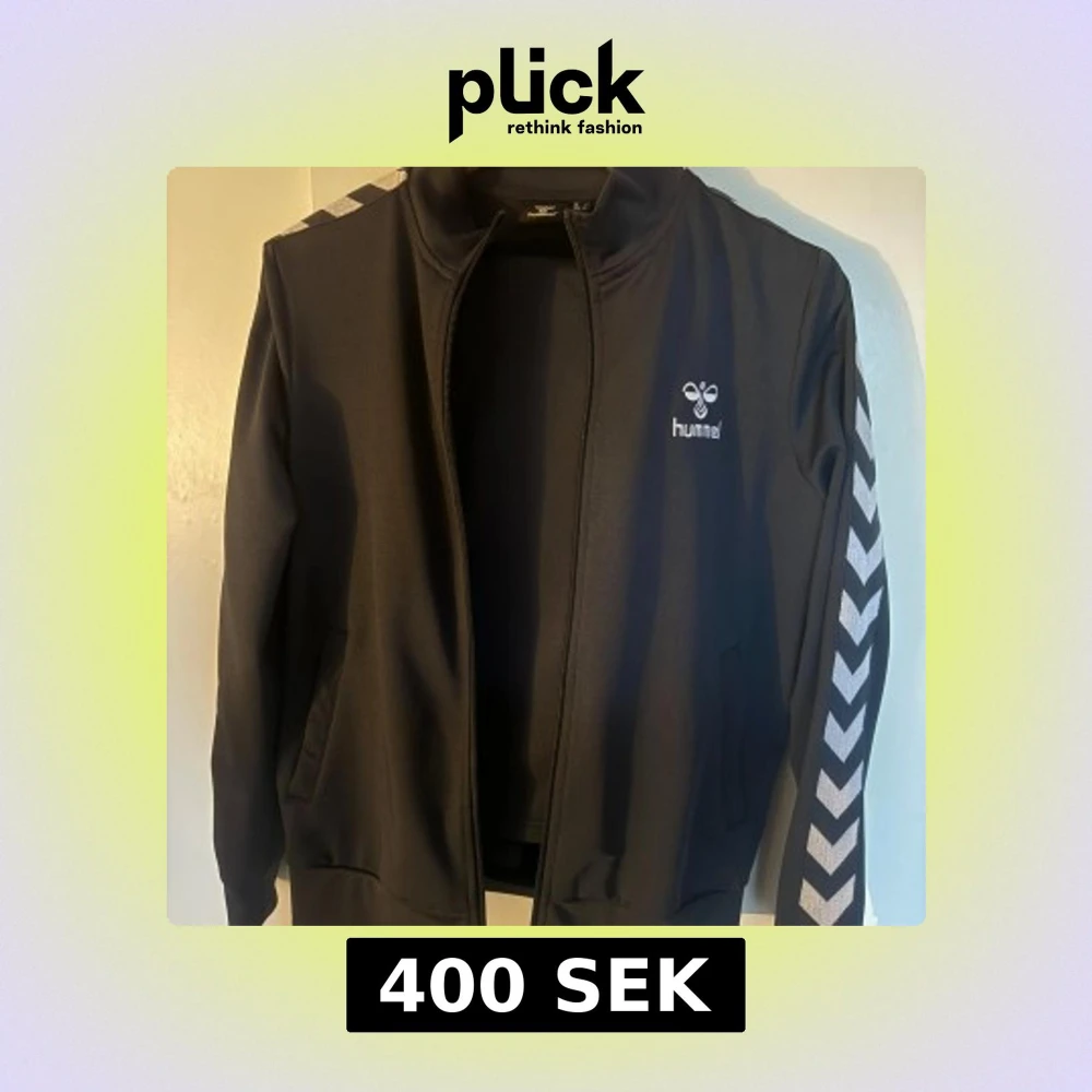 Två svarta träningsjackor, en från Hummel med vita chevronmönster på ärmarna och en från Adidas med klassiska ränder. Båda har dragkedja och långärmade design. Perfekta för sport och vardag. S-M två för 400kr 300kr/st