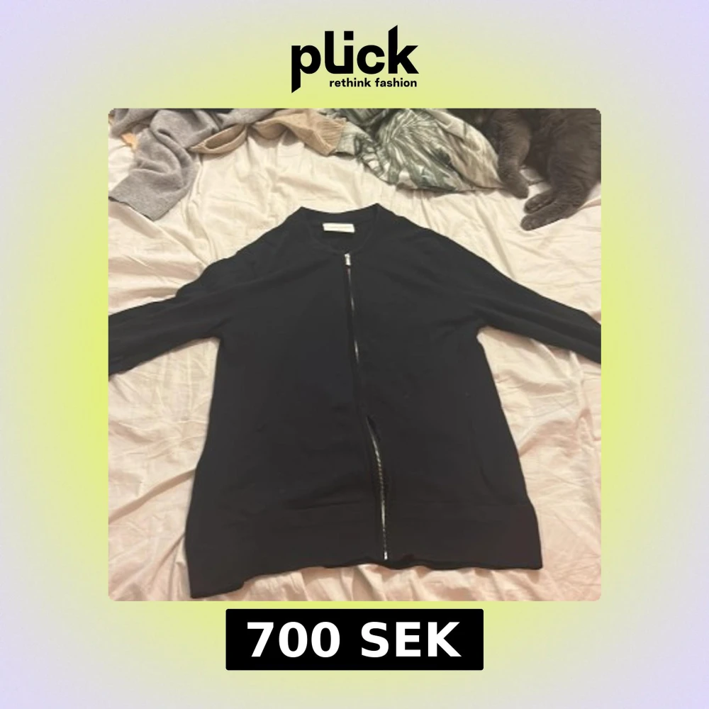 Säljer en stilren svart jacka med dragkedja framtill. Jackan har långa ärmar och en enkel design som passar perfekt för en avslappnad look. Perfekt för svala dagar!