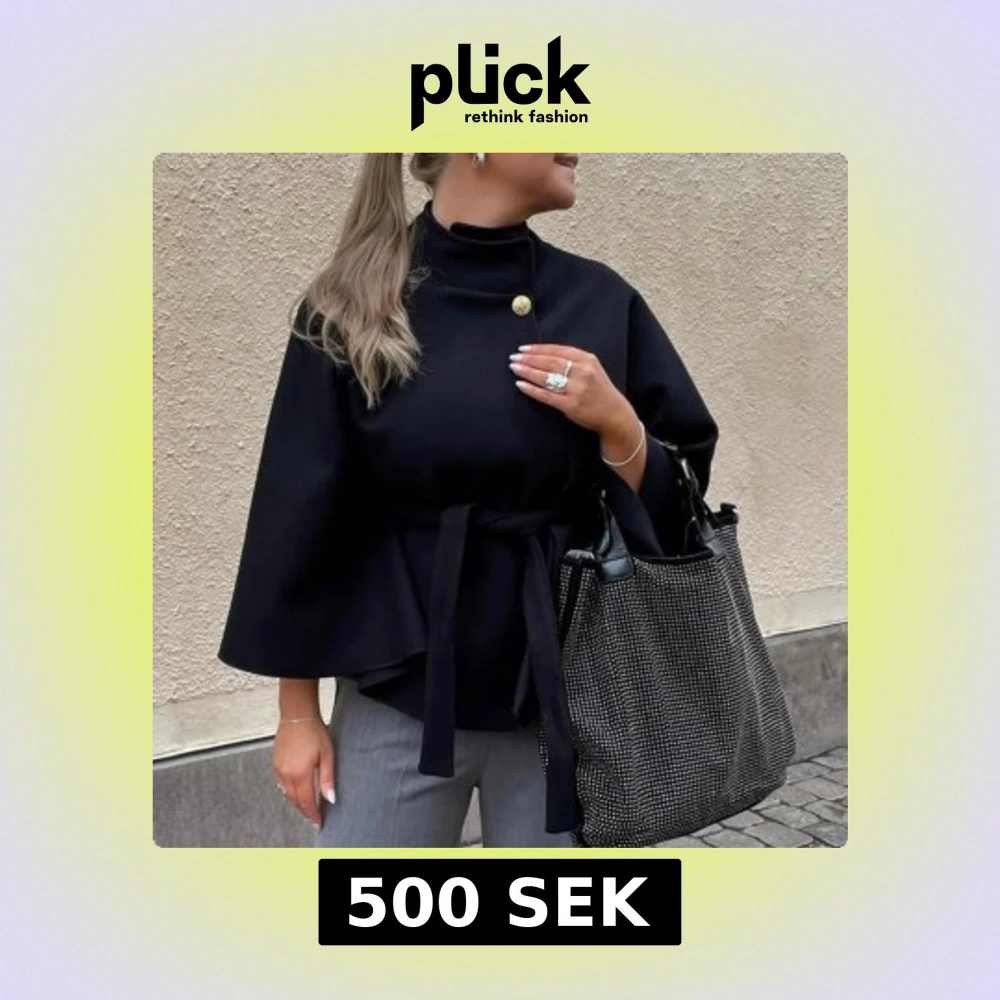 Snygg svart kappa med hög krage, knytbälte i midjan och dekorativ guldig knapp vid halsen. Köpt från misay men aldrig använd prislappen kvar.