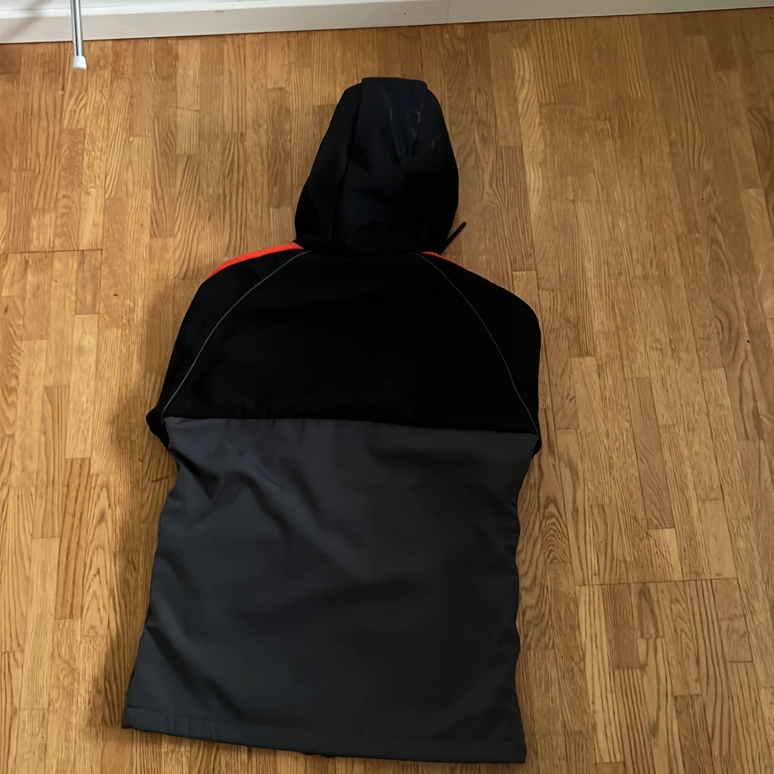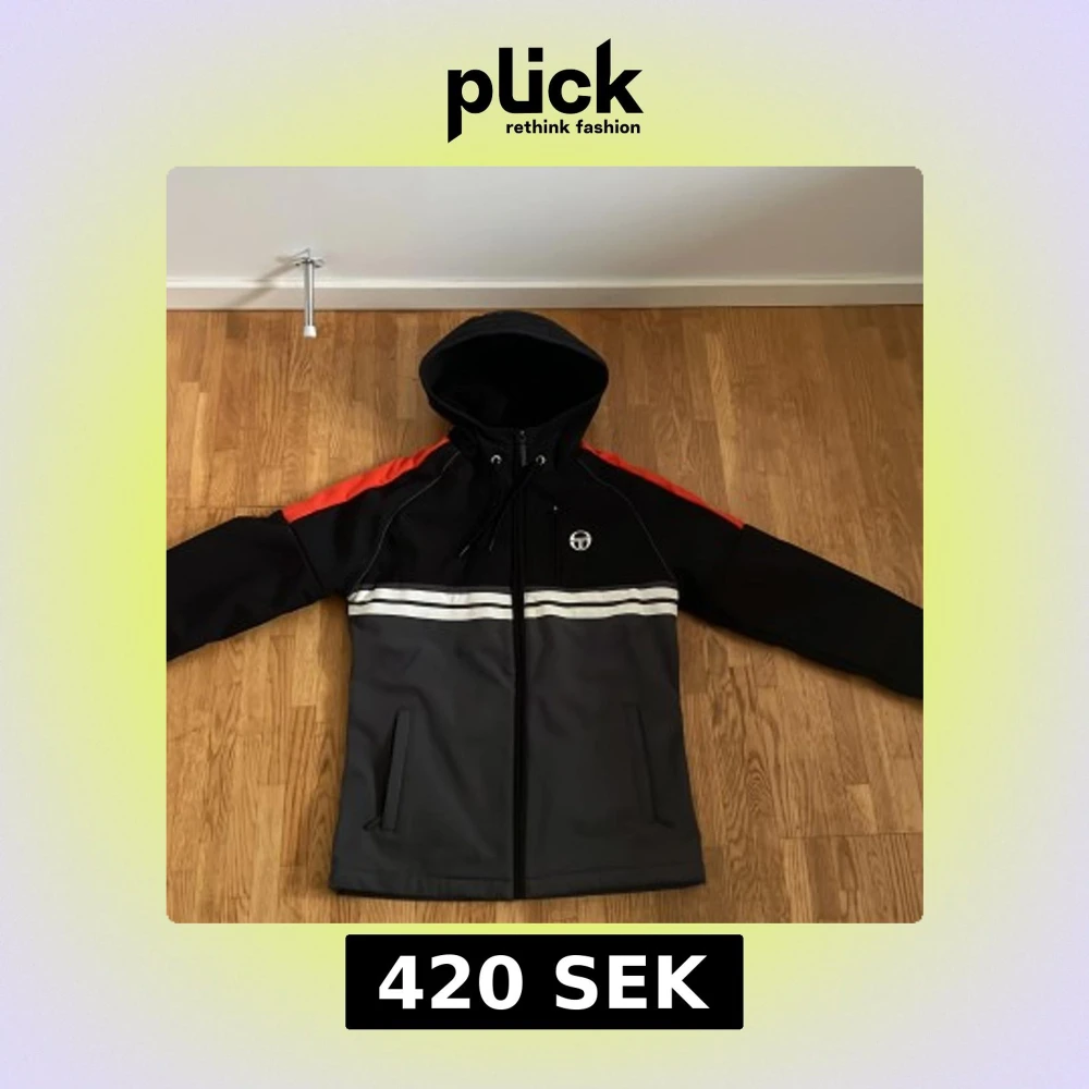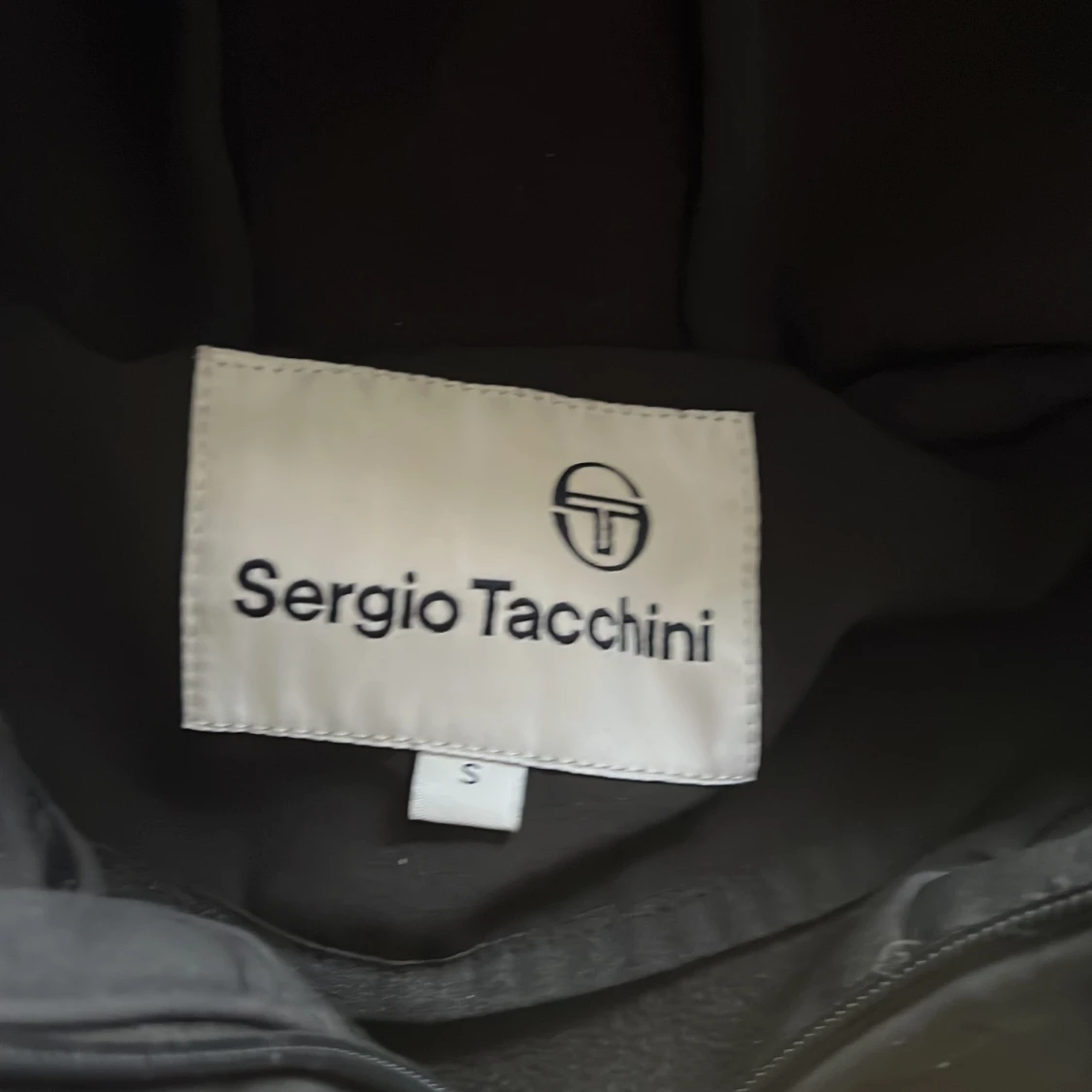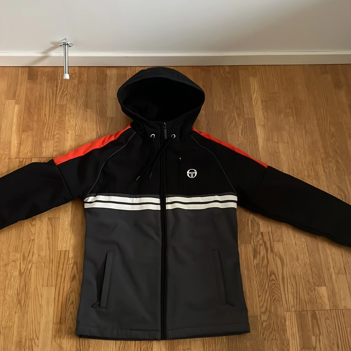 Snygg softshell/vindjacka från Sergio Tacchini i svart och mörkgrått med röda detaljer på axlarna. Jackan har huva med snörning, dragkedja framtill, två fickor och vita ränder över bröstet. Perfekt för dig som gillar sportig stil.