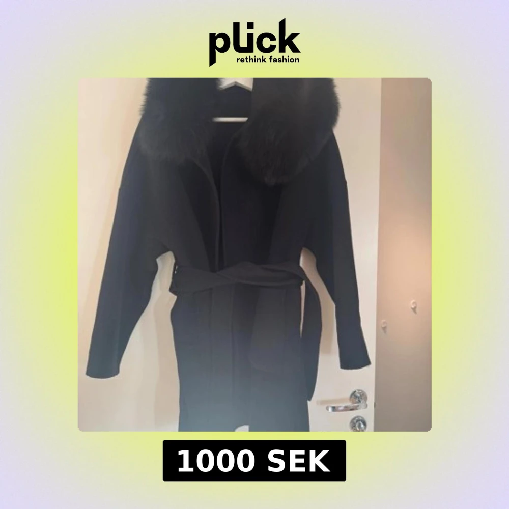 Snygg svart kappa med bred krage i fluffig äkta päls och knytbälte i midjan. Jackan har långa ärmar och två stora fickor framtill. Perfekt för dig som vill ha en stilren och lyxig look under höst och vinter. Knappt använd, storlek S men passar M