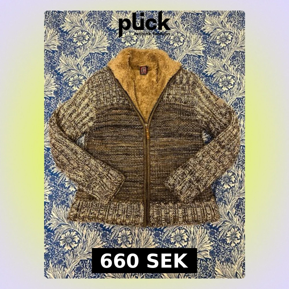 Cardigan med värmande fodring. Grovstickad utsida i kombination med innerfoder. På etiketten står storlek M, men den sitter som s/xs. Inga defekter