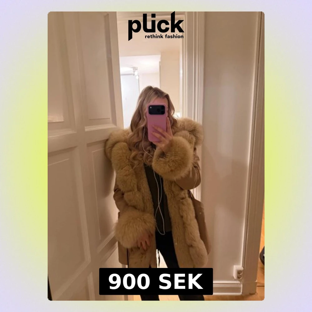Säljer en beige pälsjacka med stor fluffig huva och breda pälsdetaljer längs krage, ärmslut och framkant. Jackan har en snygg passform och band i midjan. Perfekt till vintern.