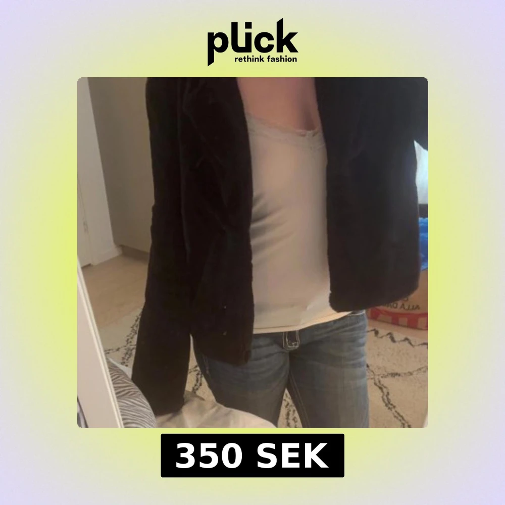 Mysig svart pälsjacka med bred krage. Jackan har en enkel, stilren look som passar perfekt till jeans eller kjol. Den är fluffig och ger en trendig vibe, perfekt för kyligare dagar.