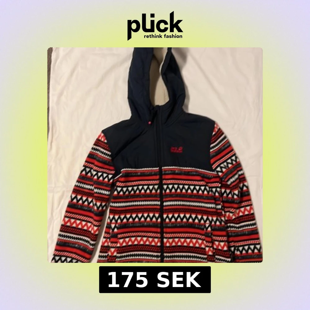 Säljer en färgglad fleecejacka från Jack Wolfskin med ett geometriskt mönster i rött, svart och vitt. Jackan har en huva och dragkedja framtill. Perfekt för kyliga dagar med sin mjuka insida.