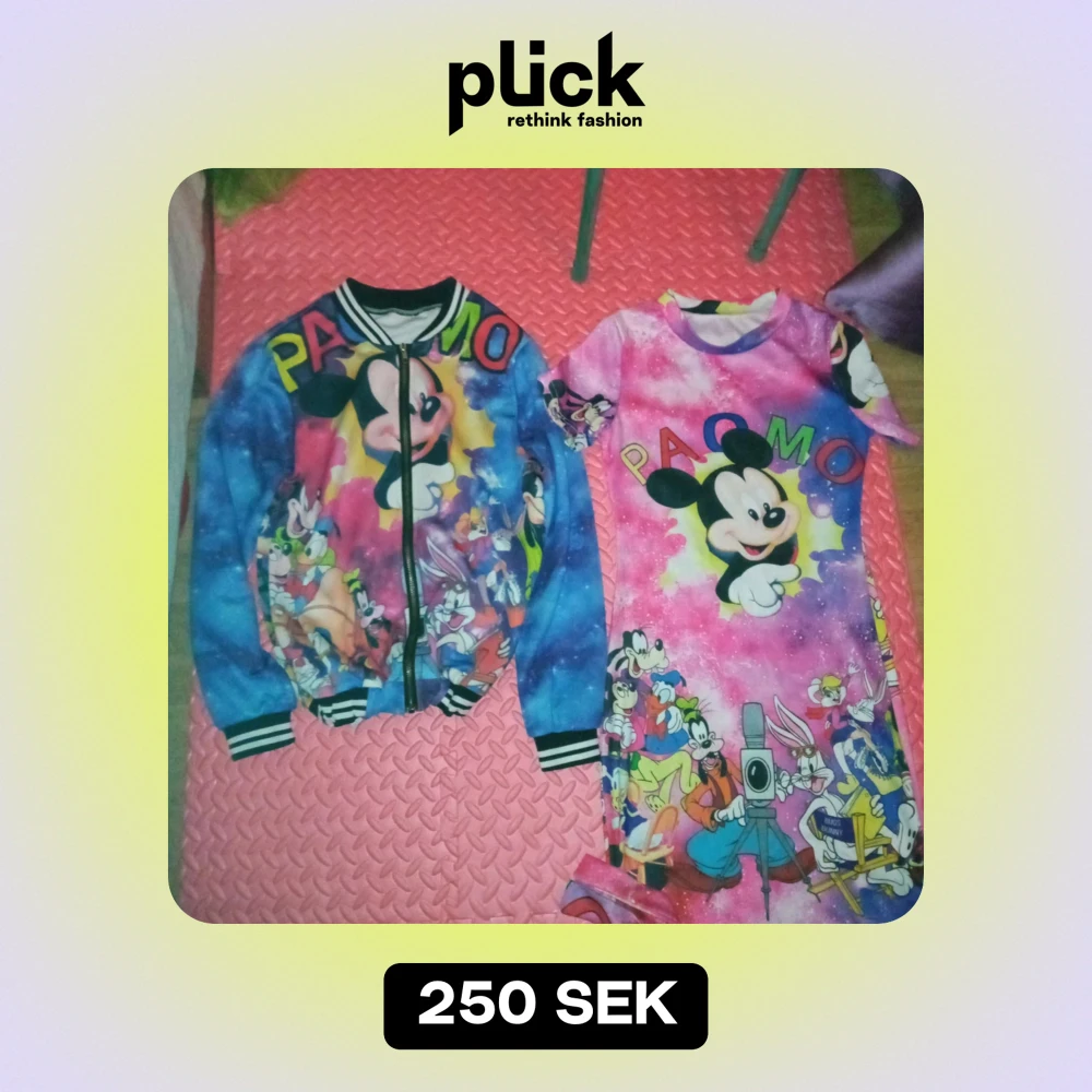 Säljer en färgglad bomberjacka med Disney-motiv o klänning.. Jackan har en dragkedja framtill och långa ärmar. Den är dekorerad med karaktärer som Musse Pigg och andra Disney-figurer i en livlig färgpalett av blått, rosa och gult.