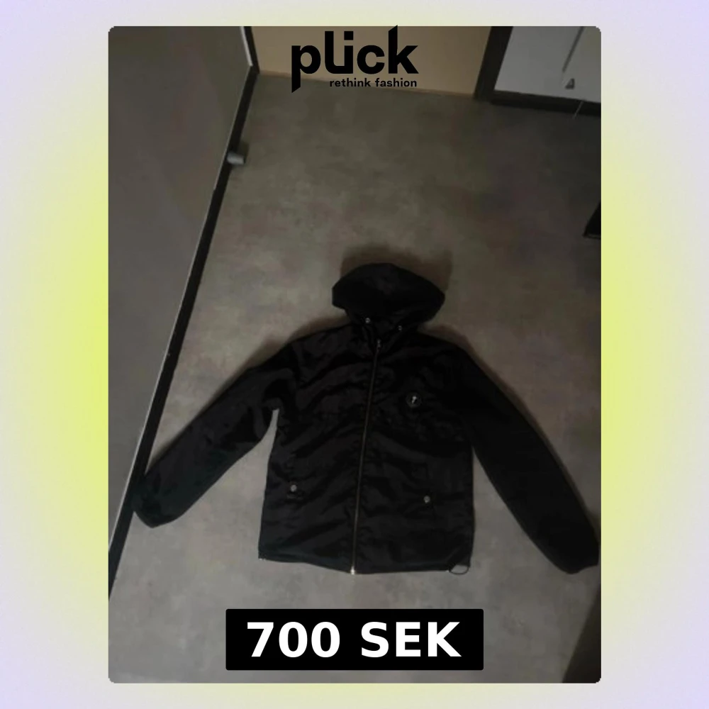 Svart vindjacka med huva och dragkedja framtill. Jackan har två fickor med knappar och ett diskret märke på bröstet. På ryggen finns en broderad text. Perfekt för blåsiga dagar och enkel att matcha.