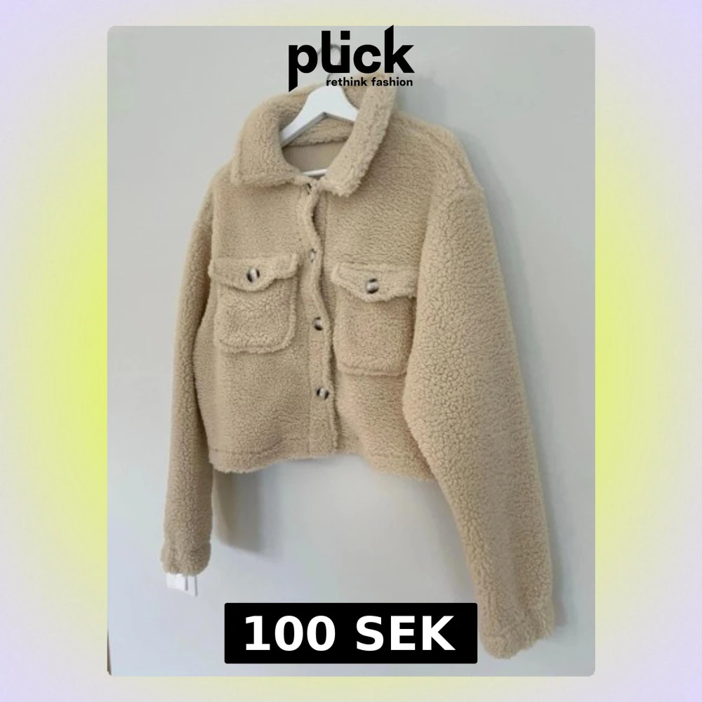 Mysig beige teddyjacka med två stora bröstfickor och knappar framtill. Materialet är mjuk polyesterblandning som känns fluffig och varm.