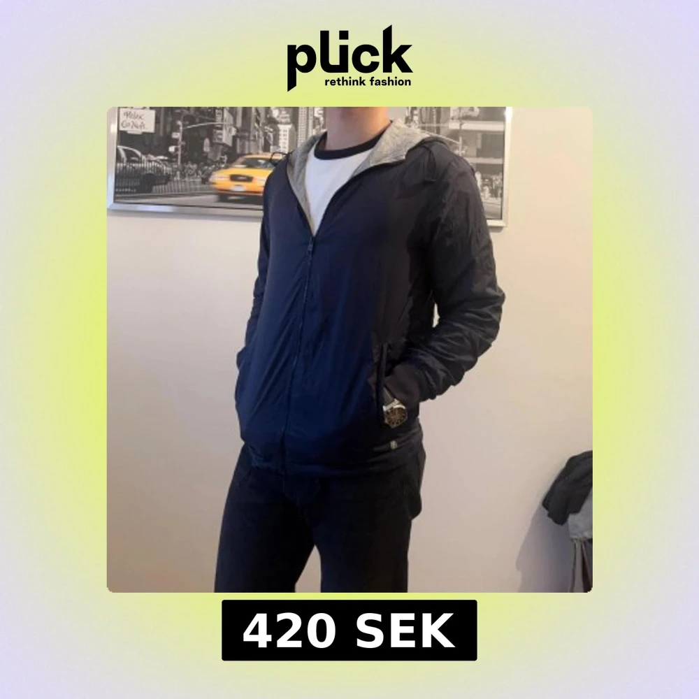 Snygg mörkblå vindjacka med grått innerfoder och huva. Jackan har dragkedja framtill, två sidofickor och ribbade muddar vid ärmsluten. Perfekt för blåsiga dagar och enkel att matcha med olika outfits.