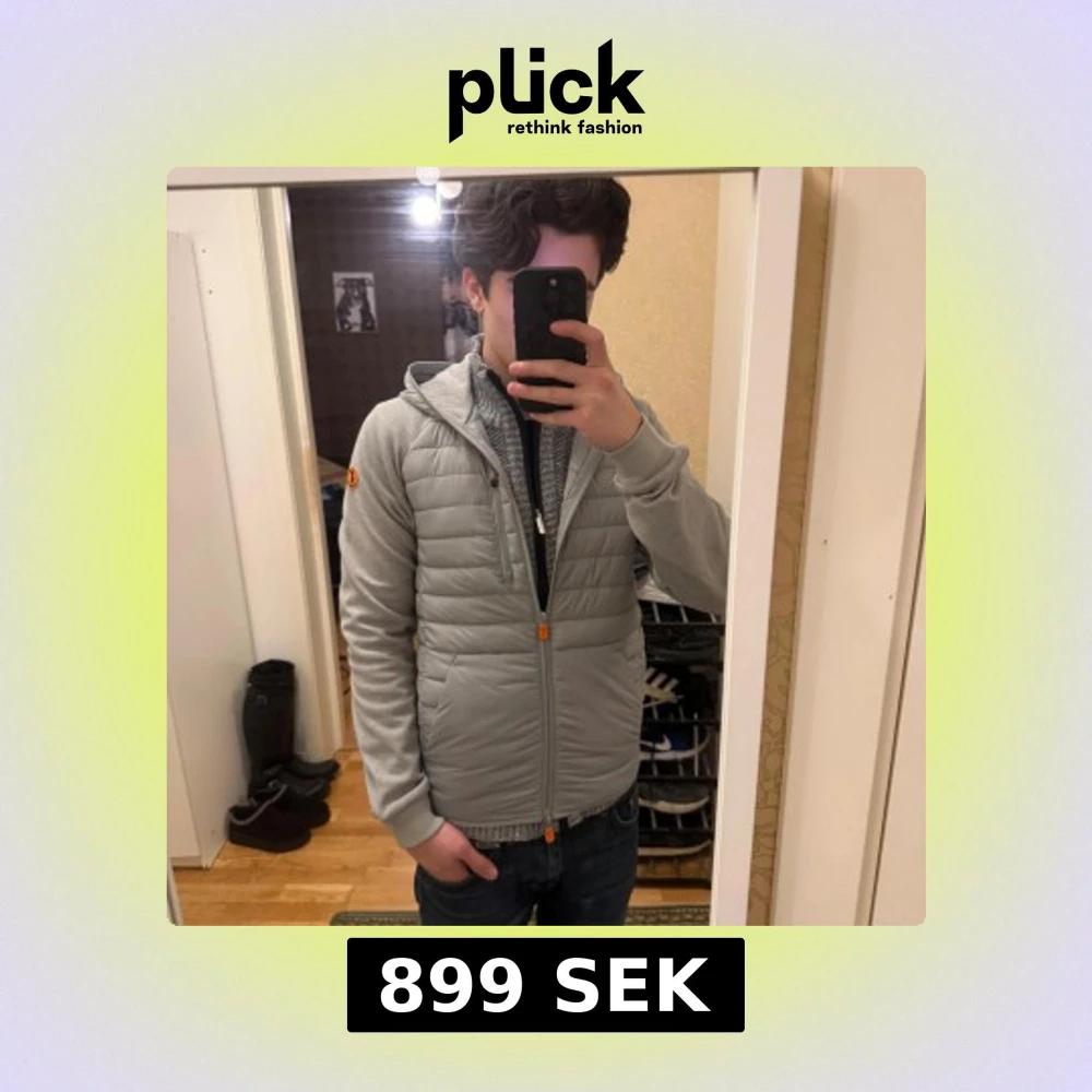 Säljer en grå cardigan från Save The Duck i storlek S. Jackan har huva, orange detaljer på dragkedjorna och ett snyggt emblem på ärmen. Materialet är mestadels polyester och nylon, med quiltad framsida och mjuka ärmar.