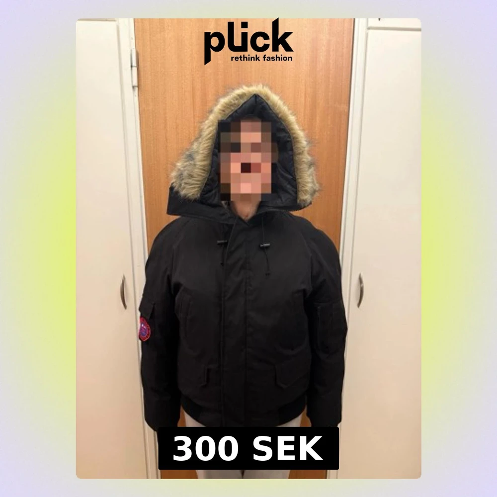 Säljer en svart pufferjacka med stor huva och fuskpäls runt kanten. Jackan har flera fickor, ribbade muddar och patch på ärmen. Perfekt för kalla dagar och riktigt skön passform. Stängs med dragkedja och knappar framtill. Herr jacka strl S men kan funka på M. (på bilden har en tjej på sig jackan)