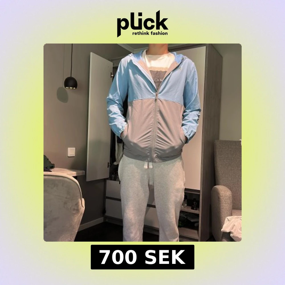 Säljer en stilren vindjacka i ljusblått och grått med huva och dragkedja framtill. Perfekt för dig som gillar en clean och sportig look. Pris kan diskuteras