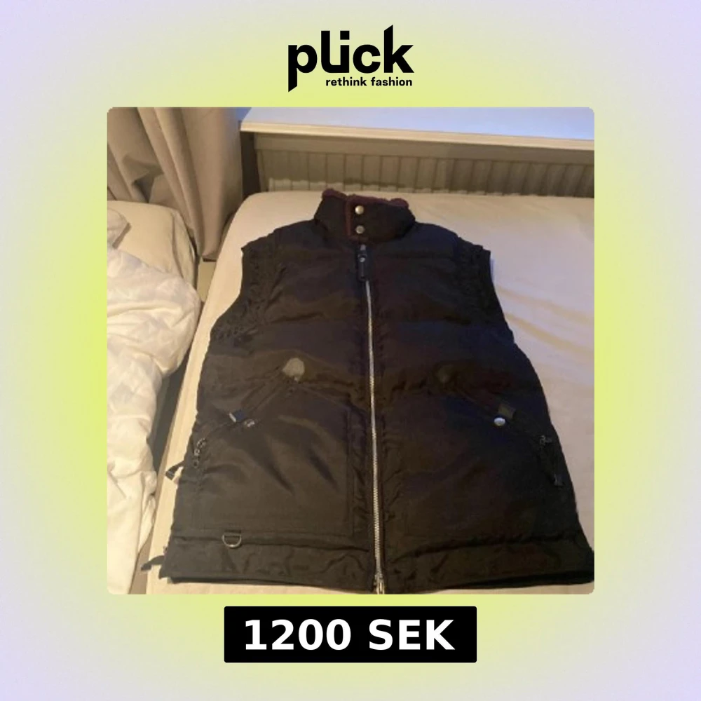 Säljer en svart dunväst med hög krage och dragkedja framtill. Västen har två fickor med knappar och detaljer i metall. Perfekt för lager-på-lager och håller dig varm under kyliga dagar.