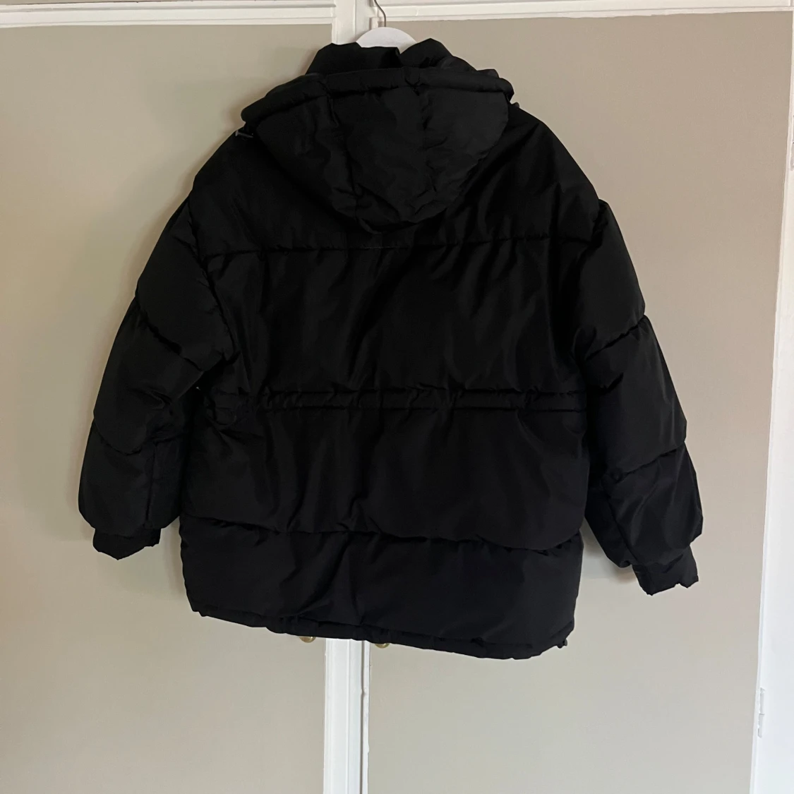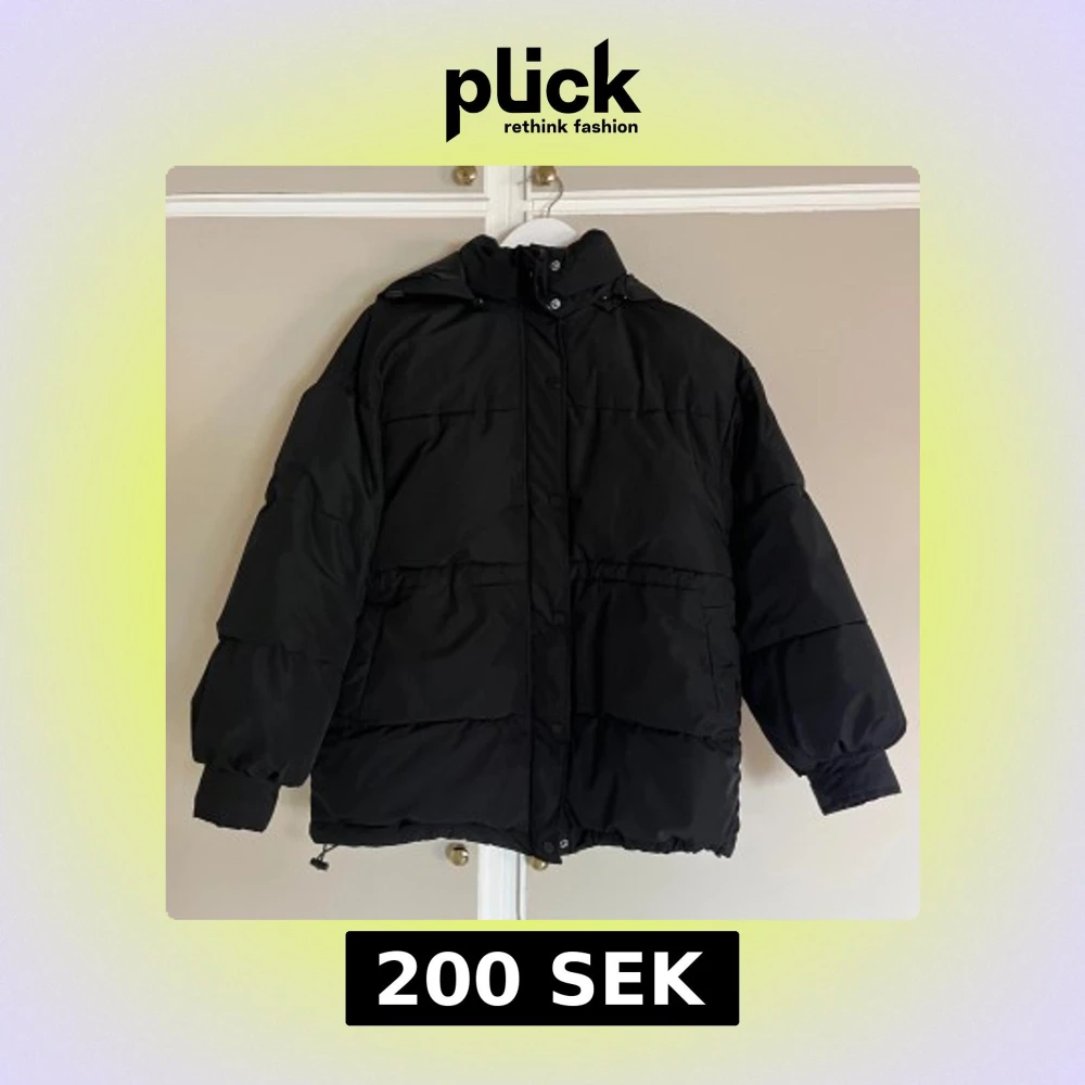 Svart pufferjacka med huva