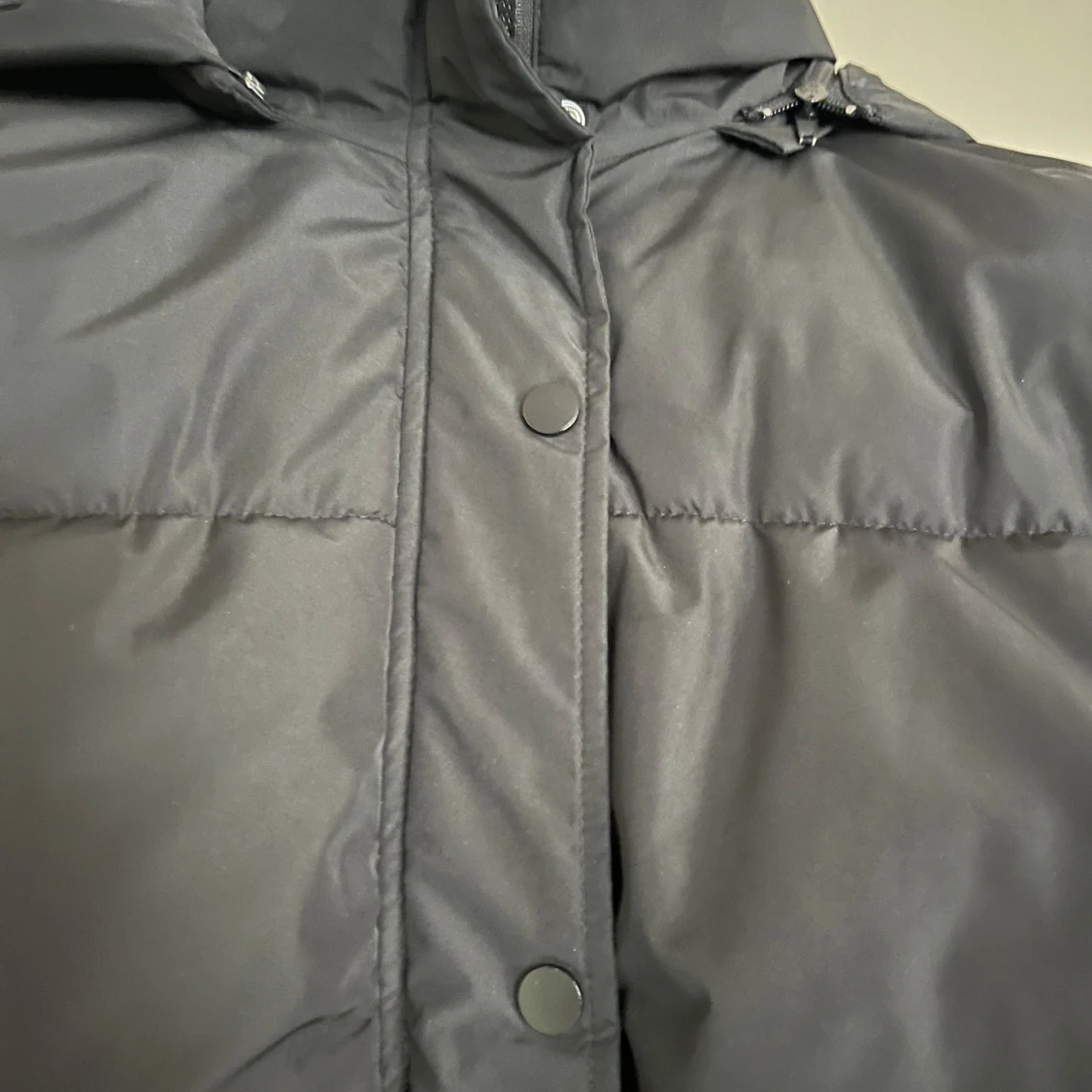 Svart pufferjacka med huva och stora fickor. Jackan har dragkedja och knappar framtill, samt elastiska muddar vid ärmsluten. Perfekt för kalla dagar med sin oversized passform och quiltade paneler. Snygg och enkel att matcha till allt.