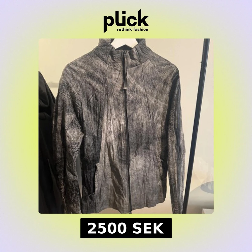 Säljer en unik grå handgjord skinnjacka från OBJECT London med coolt abstrakt mönster. Jackan har hög krage, hel dragkedja framtill och långa ärmar. Materialet är 100% läder med bomullsfoder, vilket ger en schysst känsla och look.