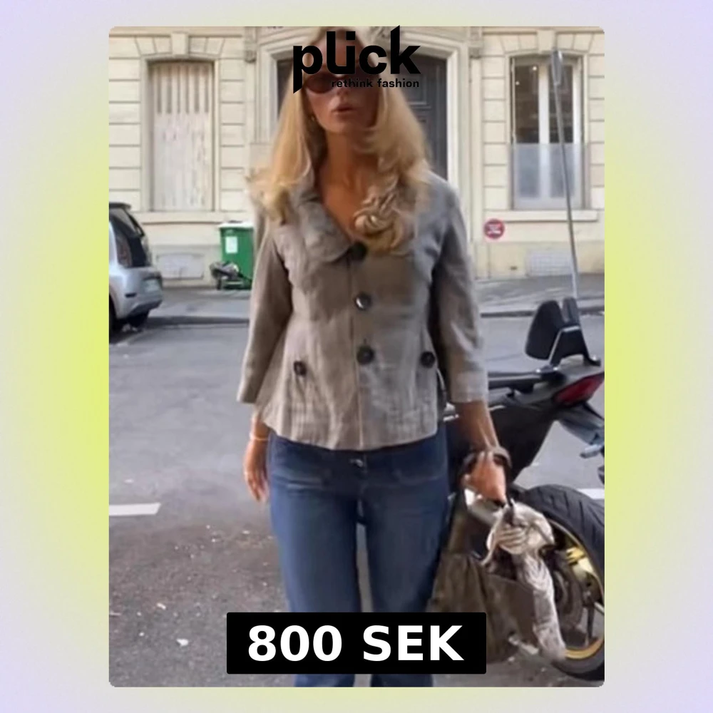 Snygg grå kavajjacka med stora dekorativa knappar framtill och trekvartsärm. Jackan har en lätt utsvängd passform och bred krage som ger en trendig look. Perfekt att styla med jeans eller kjol för en chic outfit.