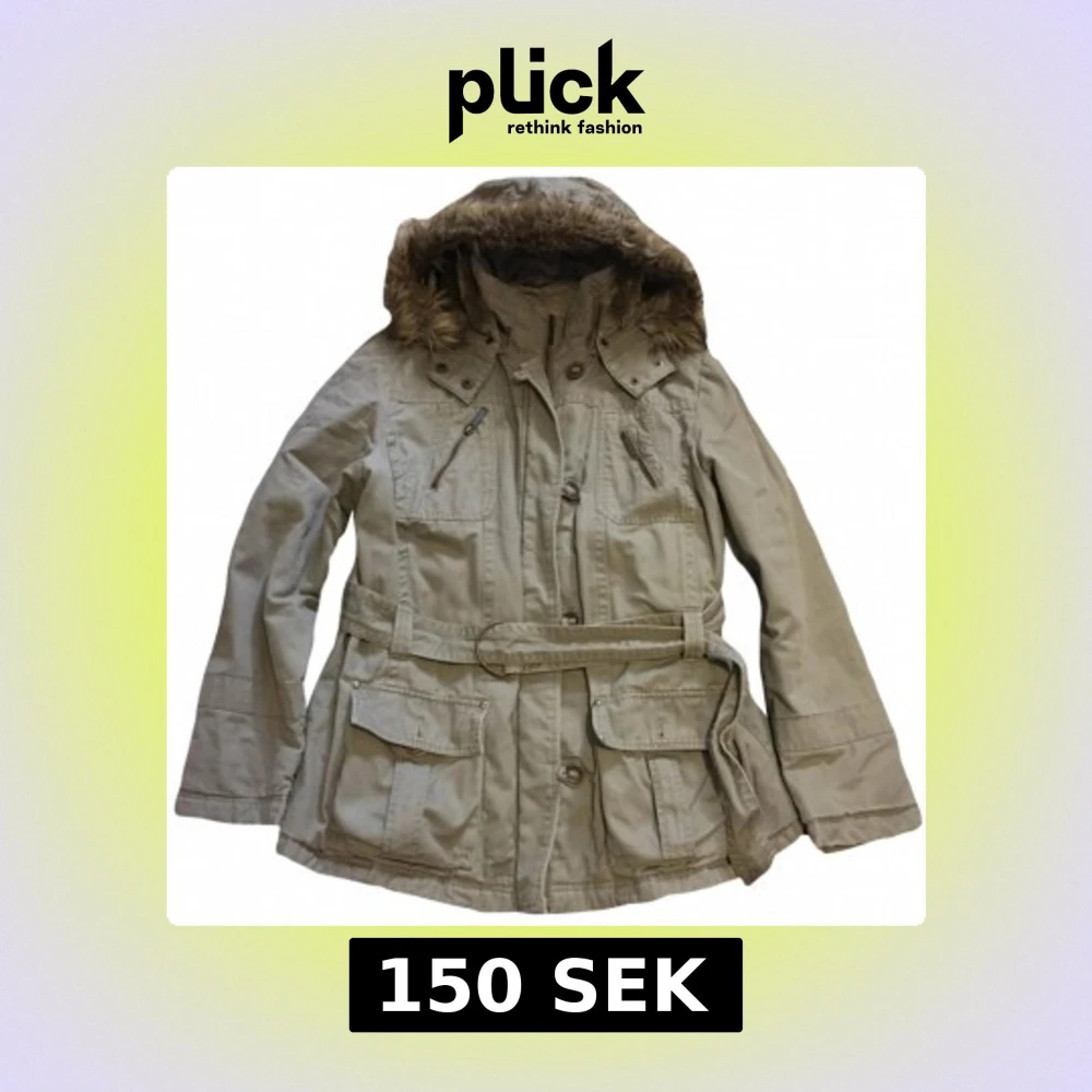 Militärgrön vår/höst jacka med pälskrage & bälte som går att ta av, (passar ca S-L beroende på hur man vill at den ska sitta)