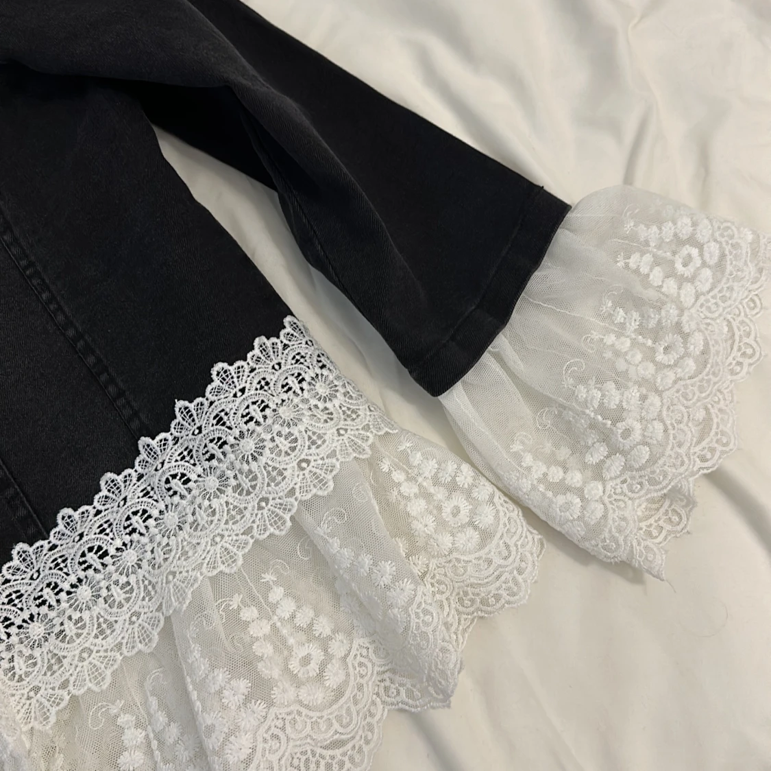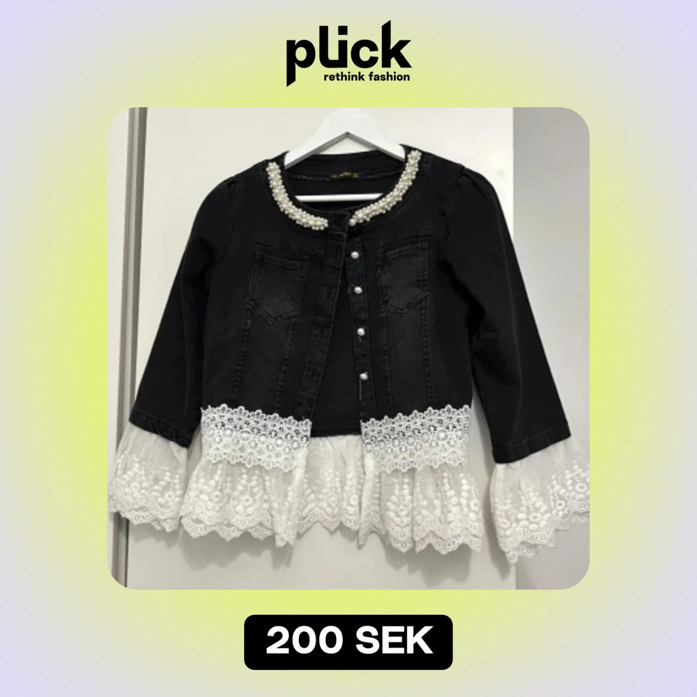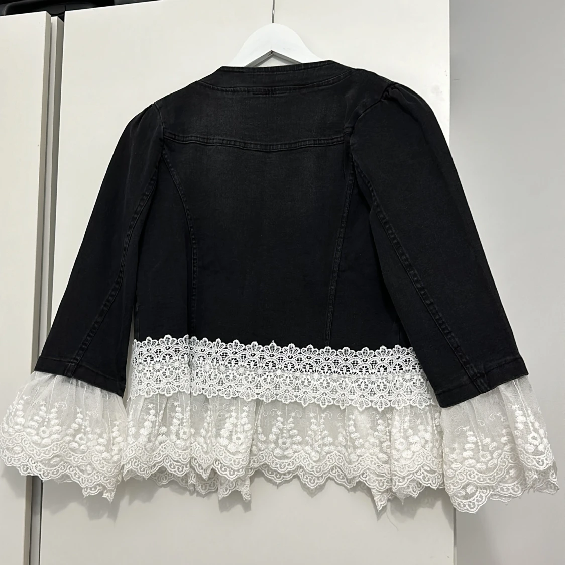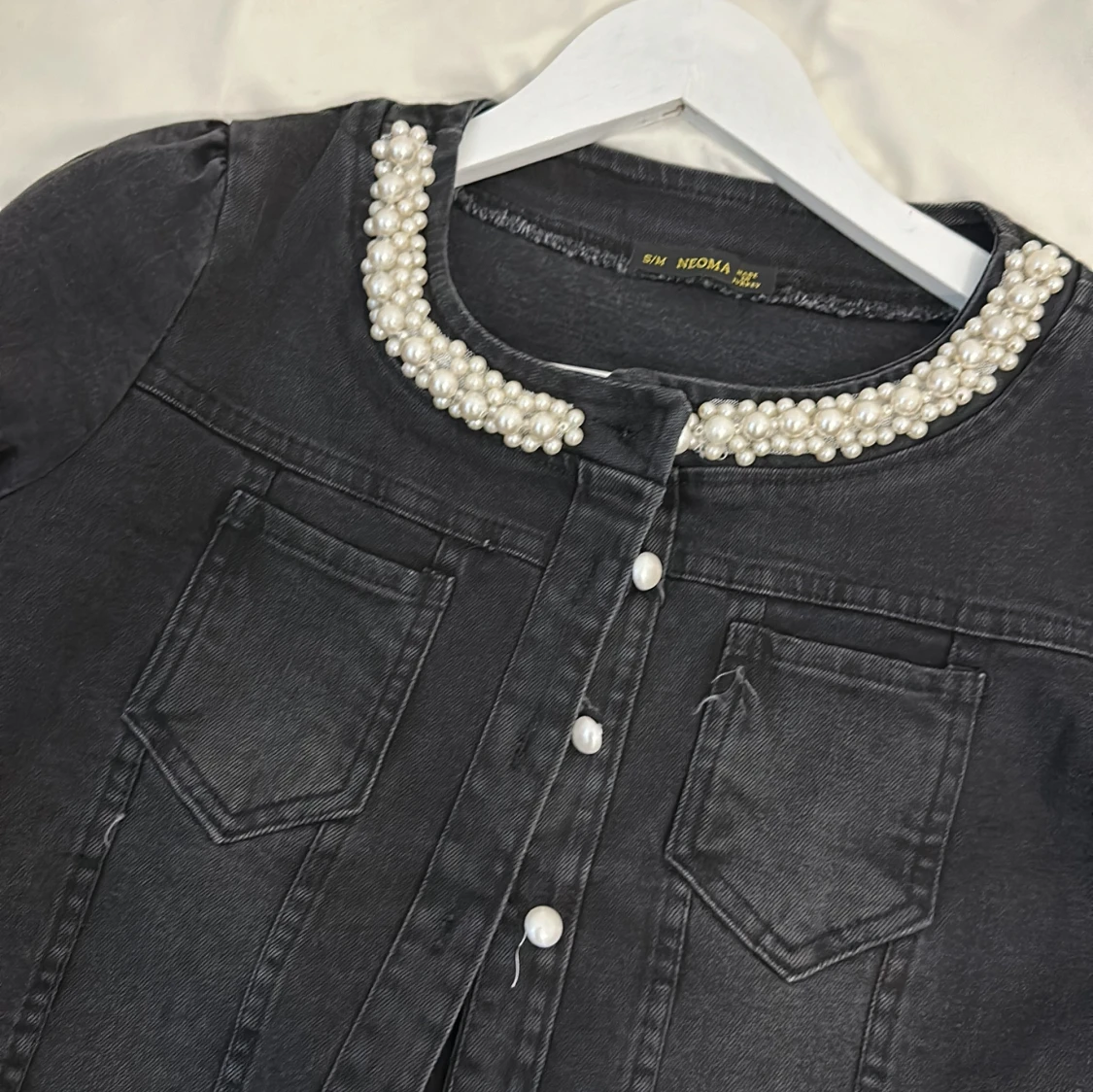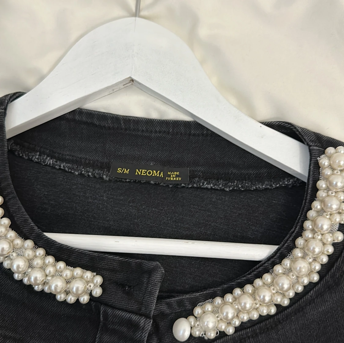 Säljer en unik svart jeansjacka från Neoma i storlek S/M. Jackan har långa ärmar och är dekorerad med vackra pärlor runt halsringningen. Den har också fina vita spetsdetaljer vid ärmslut och nederkant som ger en romantisk touch. Perfekt för att piffa upp vilken outfit som helst!