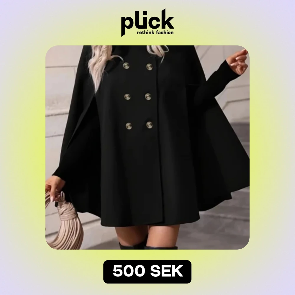 Elegant svart kappa med dubbelknäppning framtill. Den har en lös passform och klassisk design som aldrig går ur mode. i nyskick. (köpare betala frakten)