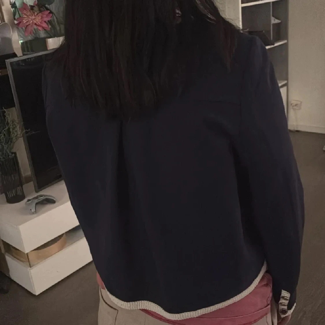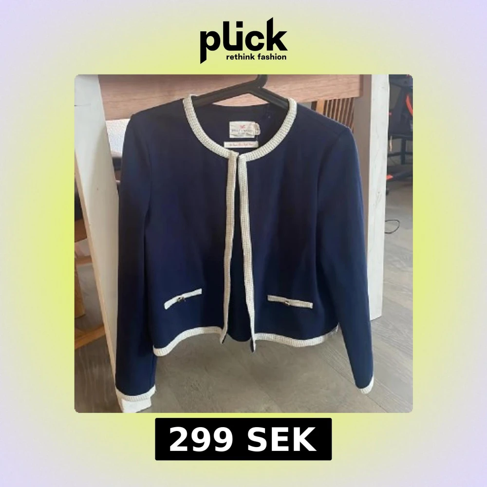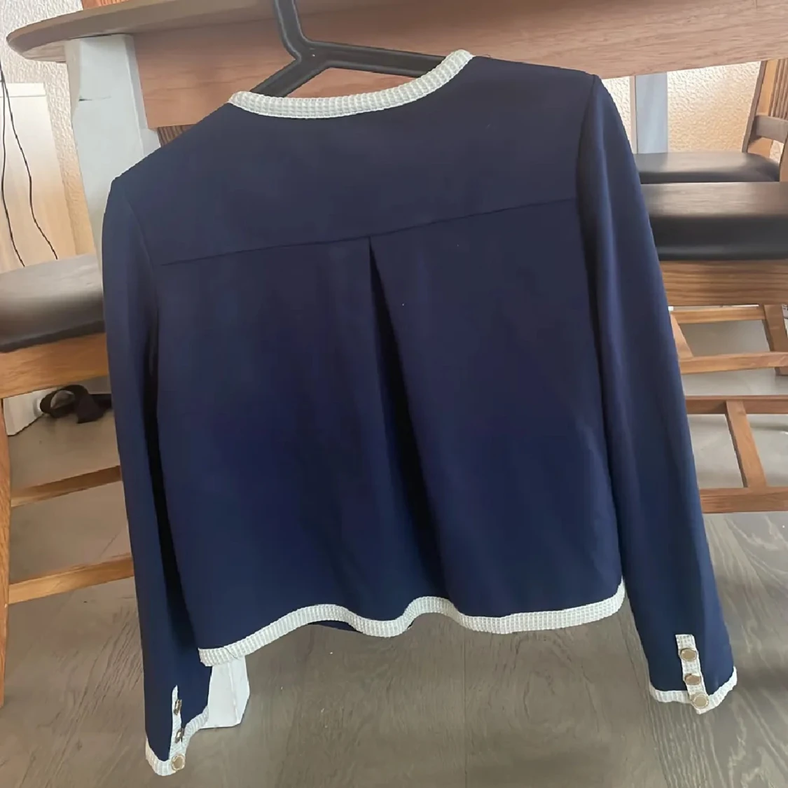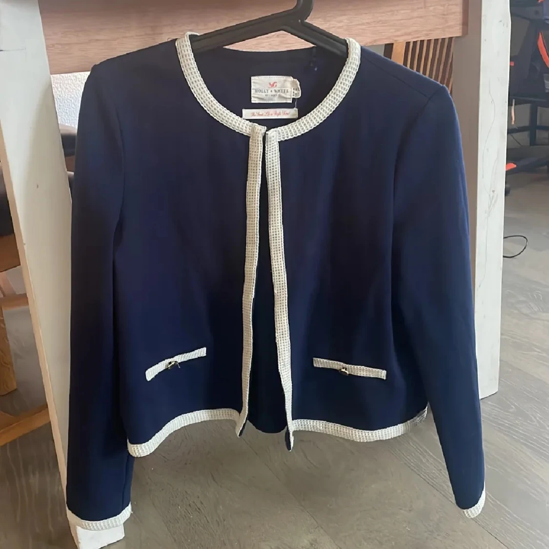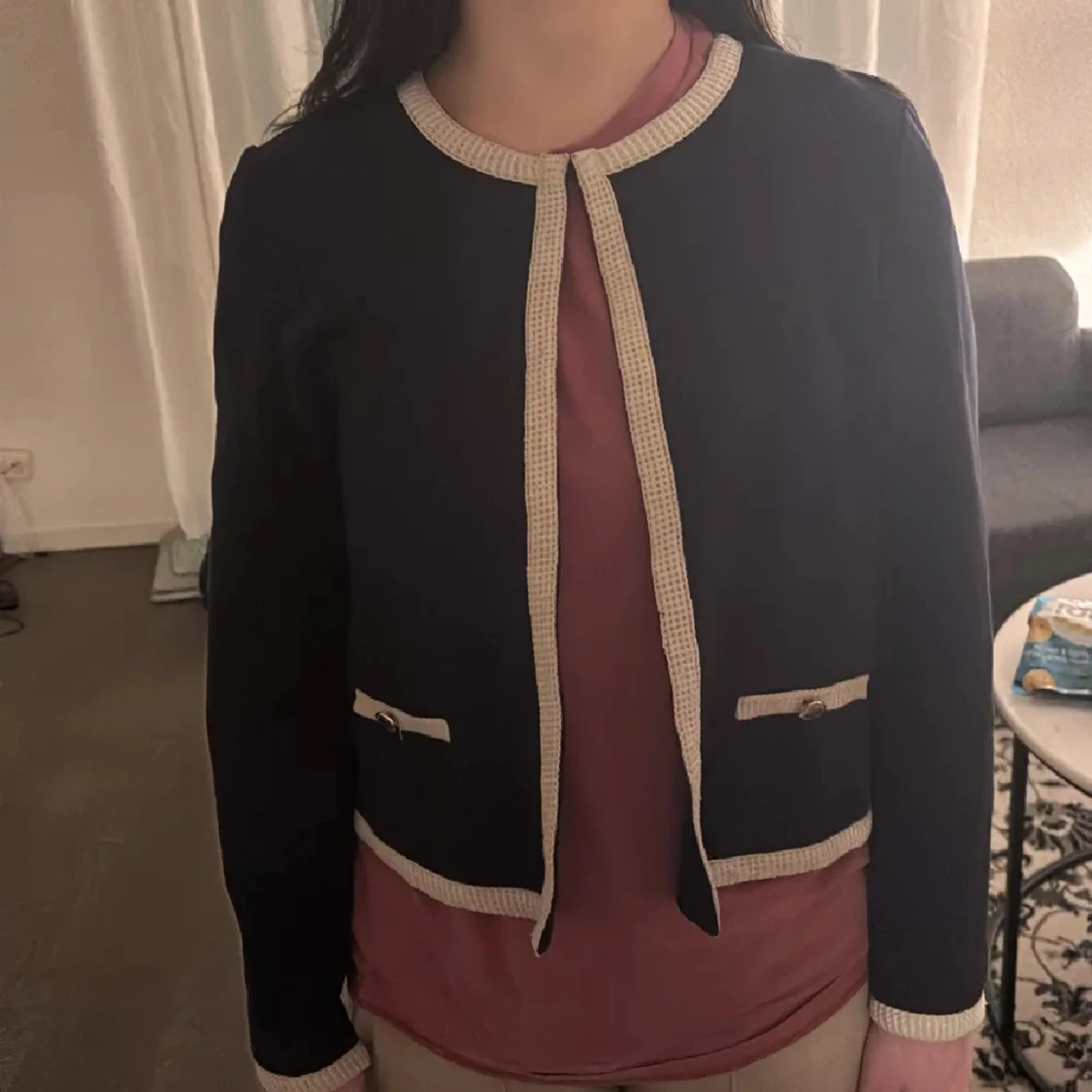 Snygg mörkblå kavaj med vita detaljer från Holly & White. Rak passform, rund halsringning och dekorativa fickor framtill. Kavajen har vita ribbade kanter längs krage, ärmslut och nederkant för en klassisk look. Perfekt för dig som gillar stilrena plagg.