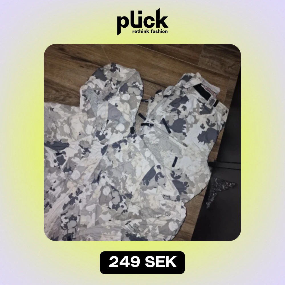 Vit kamouflage skid & snowboardkläder, jacka storlek S med till hörande byxor storlek M. Slitage på baksida byxor vid hälarna(har gått på dom) lätt att laga om man orkar, inget som stör funktionen eller syns i övrigt mycket fint skick.