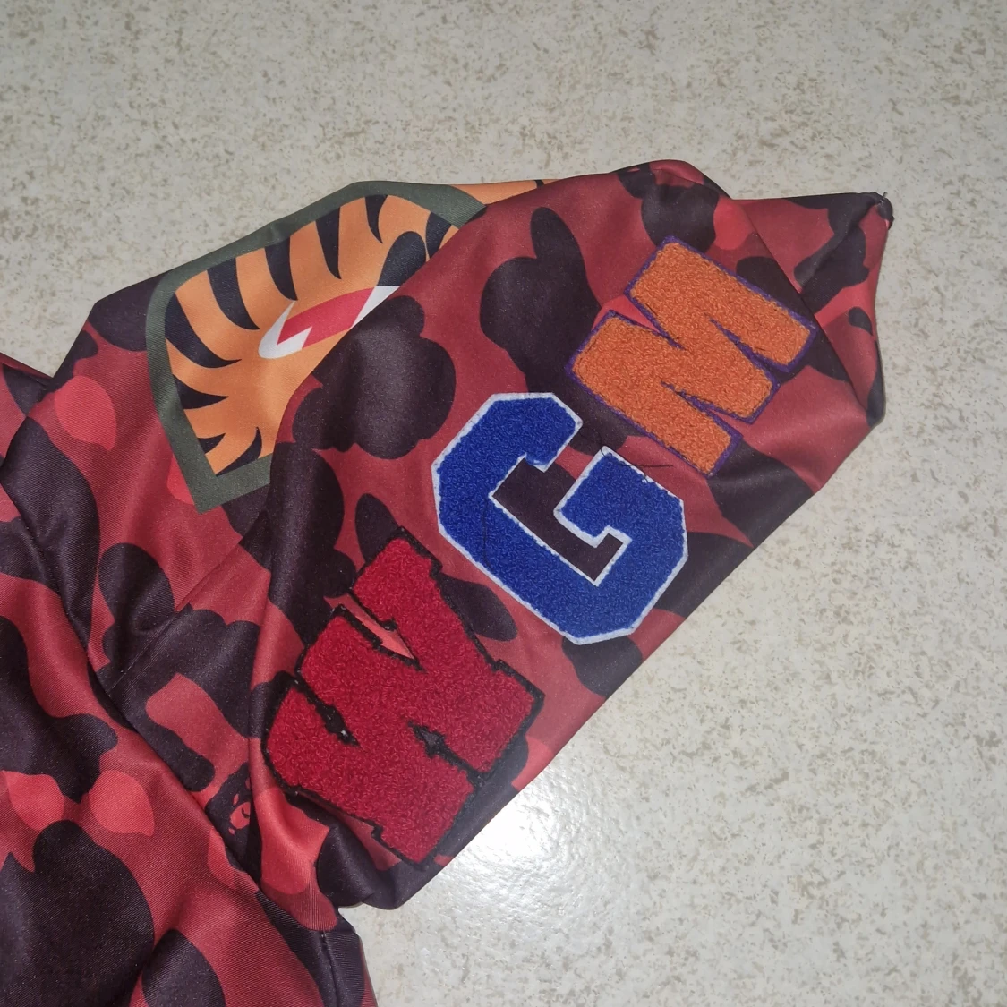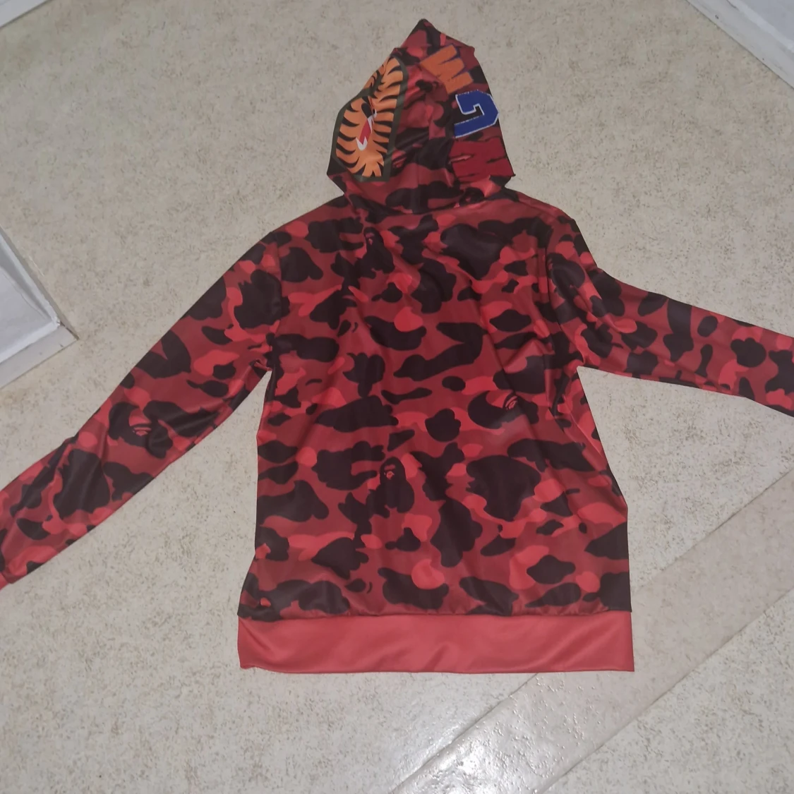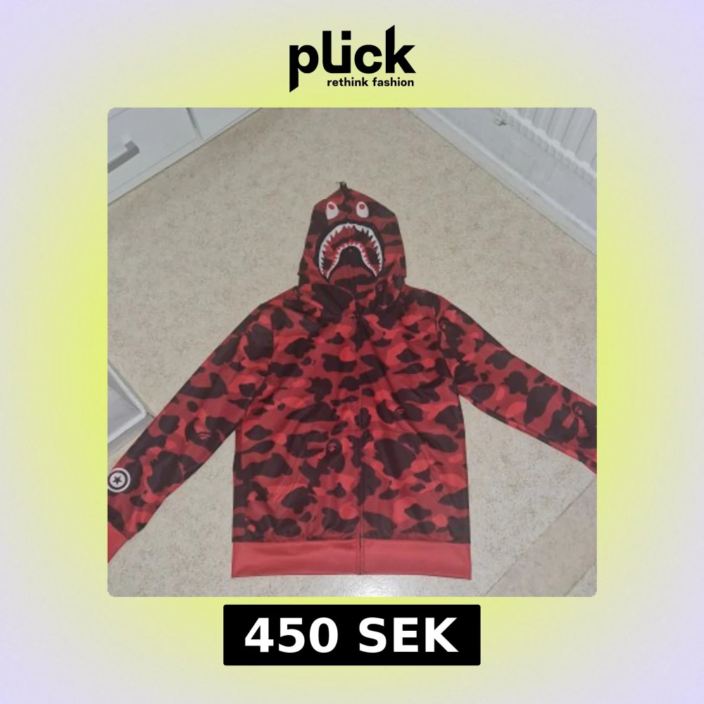 Säljer en ikonisk BAPE shark hoodie i röd camo med dragkedja hela vägen upp i huvan. Huvan har hajmotiv med tänder och ögon, samt broderade bokstäver och tigerdetalj. Jackan har fickor fram och är perfekt för dig som vill sticka ut.