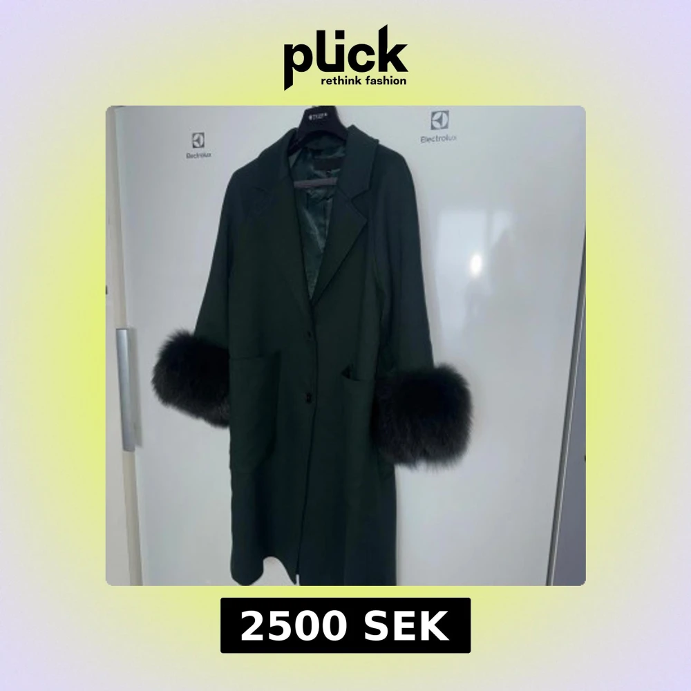 Elegant grön kappa med långa ärmar och stiliga pälsdetaljer vid ärmsluten. Perfekt för att hålla sig varm och snygg under kyliga dagar. Kappan har en klassisk design med knappar framtill och praktiska fickor.